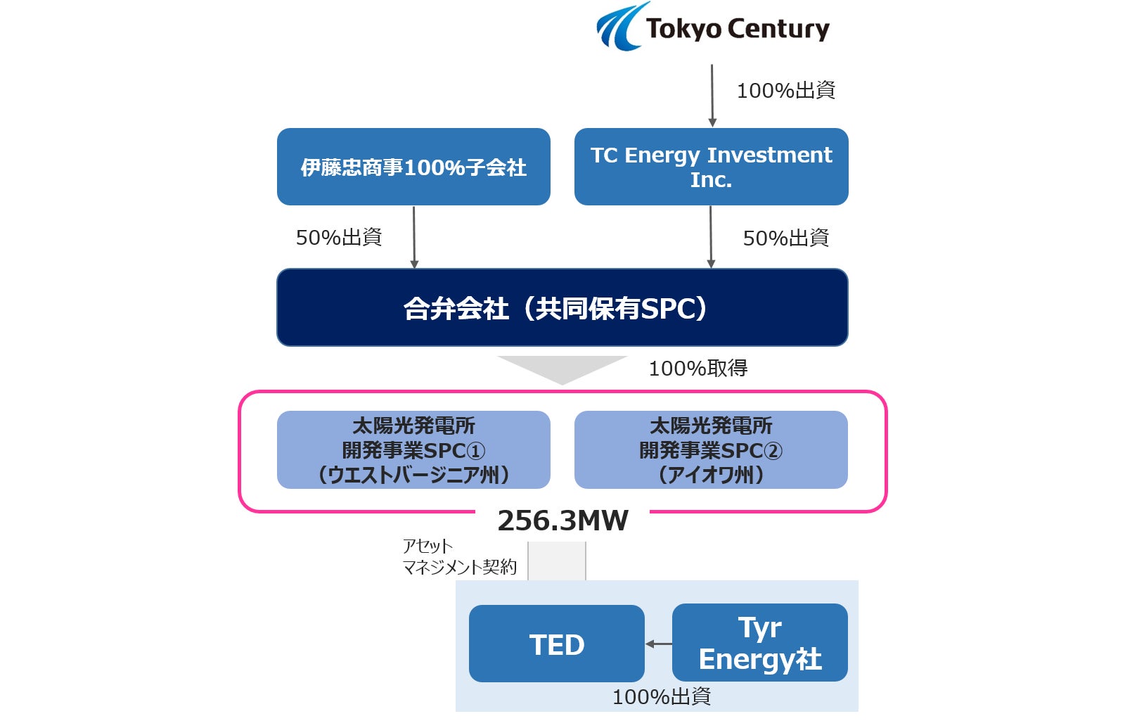 あわせて、当社の米国子会社と伊藤忠商事グループが設立する合弁会社(共同保有SPC)(※2)を通じ、Tyr Energy社の100%子会社であるTyr Energy Development Renewables, LLC(以下、「TED [テッド])から、米ウエストバージニア州およびアイオワ州に所在する2件の太陽光発電所開発権益を取得することといたしました。
