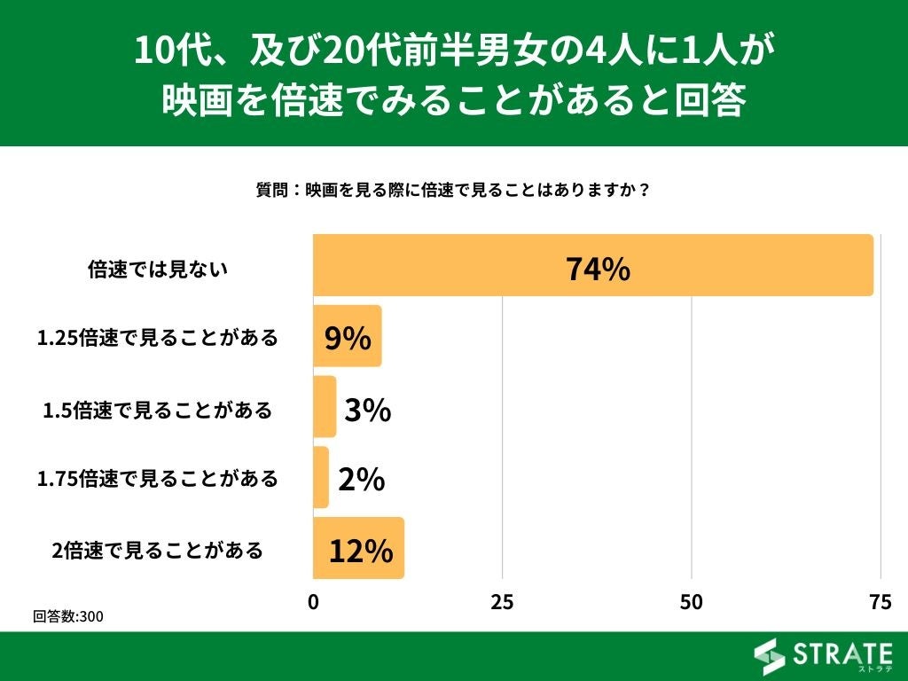 10代~20代前半の男女を対象とした「映画を見る際に倍速で見ることはありますか?」というアンケートで最も多かった回答は「倍速では見ない」で74%でした。
