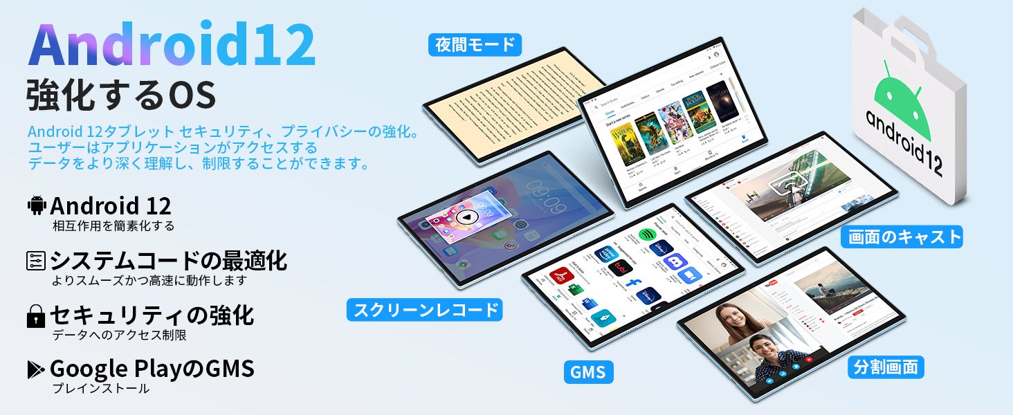 最新バーションのAndroid11オペレーティングシステムを搭載されており、バブル機能、デバイスコントロール、スクリーンレコードなど新機能で、タブレットをよりスムーズに操作可能になります。GoogleのGMS認証済み、Google Play ストアから全てのお気に入りのアプリにアクセスできます。アプリケーションも快適にご利用できます。GPS機能も付き、タブレットにオフラインマップをダウンロードすると、Googleマップが利用できます。