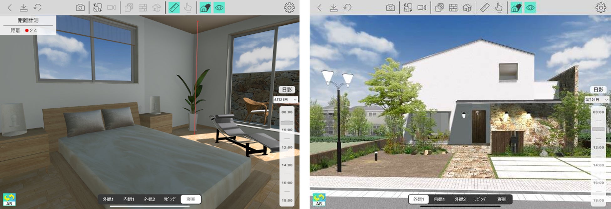 「Walk in home 360x(ウォークインホーム サンロクマルエックス)」は、「Walk in home」で作成した建物のデータをスマートフォンやタブレットで360度の角度で表示できるサービスです。モバイルデバイスを使用することで、AR機能で現地の風景と作成した物件データを合成することが可能です。また、モバイルデバイスの画面上で壁や屋根の部分透過や素材のワンタッチ変更といった編集ができます。直感的な操作で物件デザインの確認や調整が行えます。