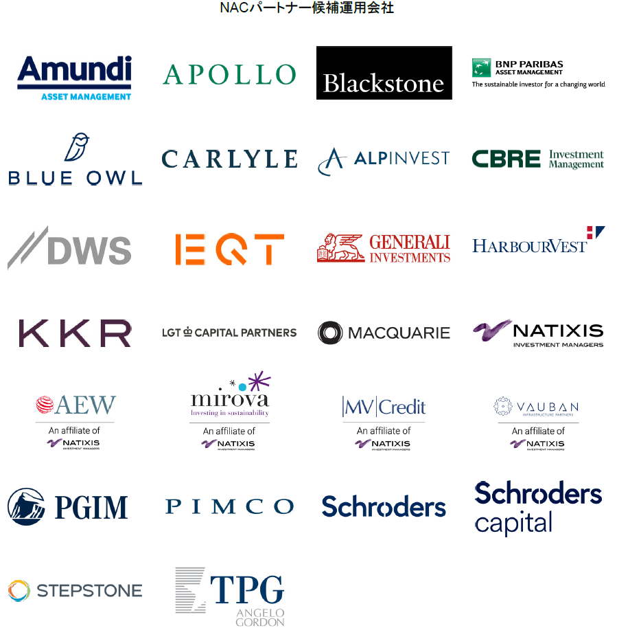 NACは、世界のオルタナティブ投資プロダクトへのアクセスを提供するサービスです。近年、オルタナティブ投資に対する投資家ニーズは国内外で急速に高まっており、そのニーズは今後も拡大が見込まれています。当社は幅広いオルタナティブ投資プロダクトの提供実績から得た知見を活かし、NACを通じて世界の有力なオルタナティブ運用会社(NACパートナー)が提供するファンドにワンストップで投資する機会を提供します。投資家は、さまざまなアセットクラス(プライベート・エクイティ/プライベート・デット/インフラストラクチャー/不動産)、地域(グローバル/北米/欧州/その他)、投資戦略、リスク選好度や投資形態(シングルファンドやファンドオブファンズといったファンドストラクチャー/流動性/事務運営など)に関するアドバイスを受けながら多様なポートフォリオを構築することが可能となります。