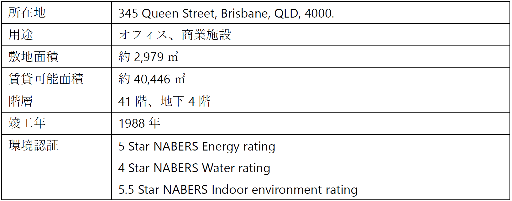 本物件は、1988年竣工のブリスベン中心業務地区である「Golden Triangle」と呼ばれるエリアに立地する、交通利便性や洗練された外観デザインが特徴のAグレードのオフィスビルです。複数の環境認証を取得するとともに、士業や金融機関、政府系機関など優良なテナントが入居しており、今後も安定した不動産賃貸収入および持続的な資産価値の向上が期待されます。