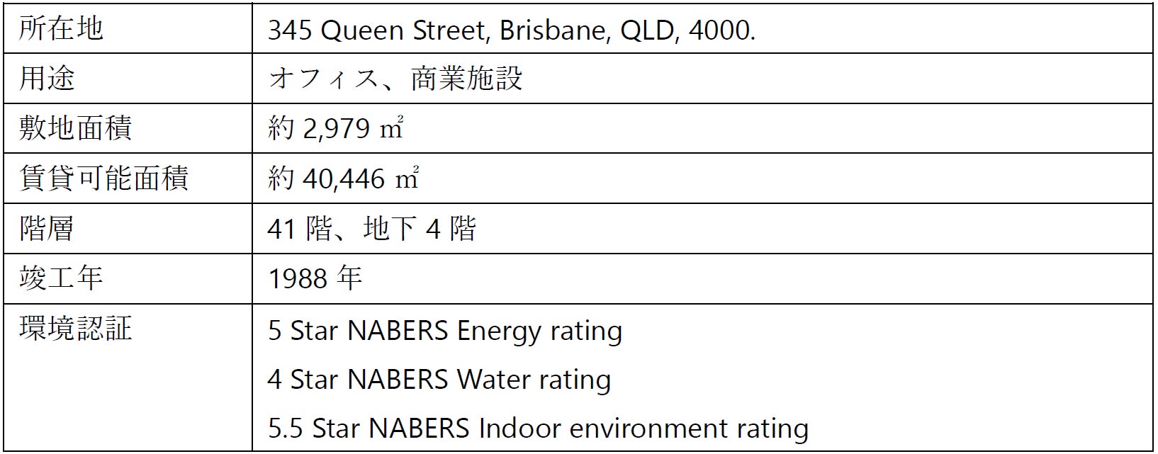 三井住友ファイナンス&リース株式会社(代表取締役社長:今枝 哲郎、以下「SMFL」)の戦略子会社、SMFLみらいパートナーズ株式会社(代表取締役社長:上田 明)傘下のSMFL MIRAI PARTNERS (SINGAPORE) PTE. LTD.(取締役社長:岸 大作)は、ケネディクス株式会社(代表取締役社長COO:寺本 光)、ARAVEST PTE. LTD.(CEO:Moses K, Song、以下「Aravest」)、および日系投資家複数社との共同出資により、豪州の不動産運用会社であるISPT Pty Ltd(CEO:Chris Chapple、以下「ISPT」)が100%所有する、ブリスベン中心業務地区に所在する大規模オフィスビル「345 Queen Street」(以下「本物件」)の持分の50%を取得したことをお知らせします。なお、本物件はISPTおよびAravestの2社が共同で運用管理を行う予定です。