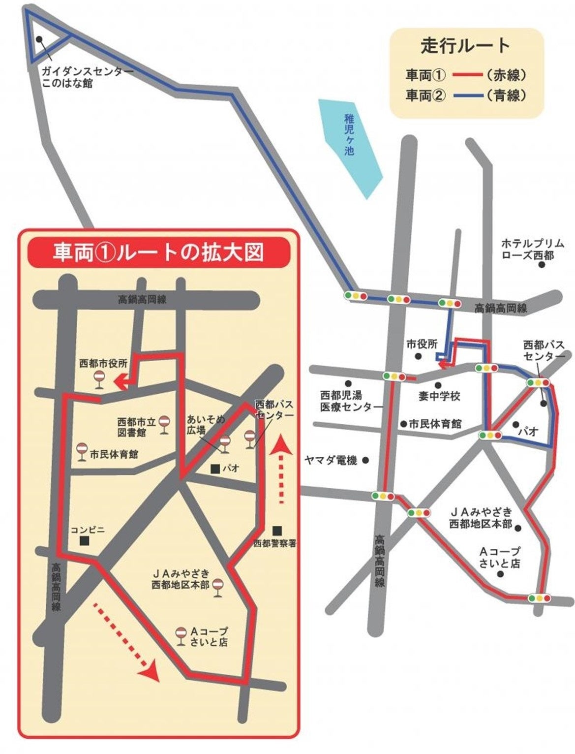 宮崎県西都市内(①妻エリア周遊ルート、②西都原古墳群観光ルート)