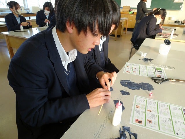 家庭クラブ委員や参加希望の高校2年生14名で、放課後に家庭科教室に集まってエコフラワーづくりにチャレンジしました。友達と色柄の違う生地を交換して、花びらを組み合わせたり、余っていたレースを付けてアレンジをしたりなどの工夫が見られました。完成したエコフラワーは、家族にプレゼントや自分の部屋に飾る用に持ち帰りました。当校では、令和6年度の家庭科の授業で、まだエコフラワーを作ったことのない新高校2年生が取り組む予定です。身近な制服を通じてSDGsを学ぶ機会にしたいと思います。 ( 手島先生より )