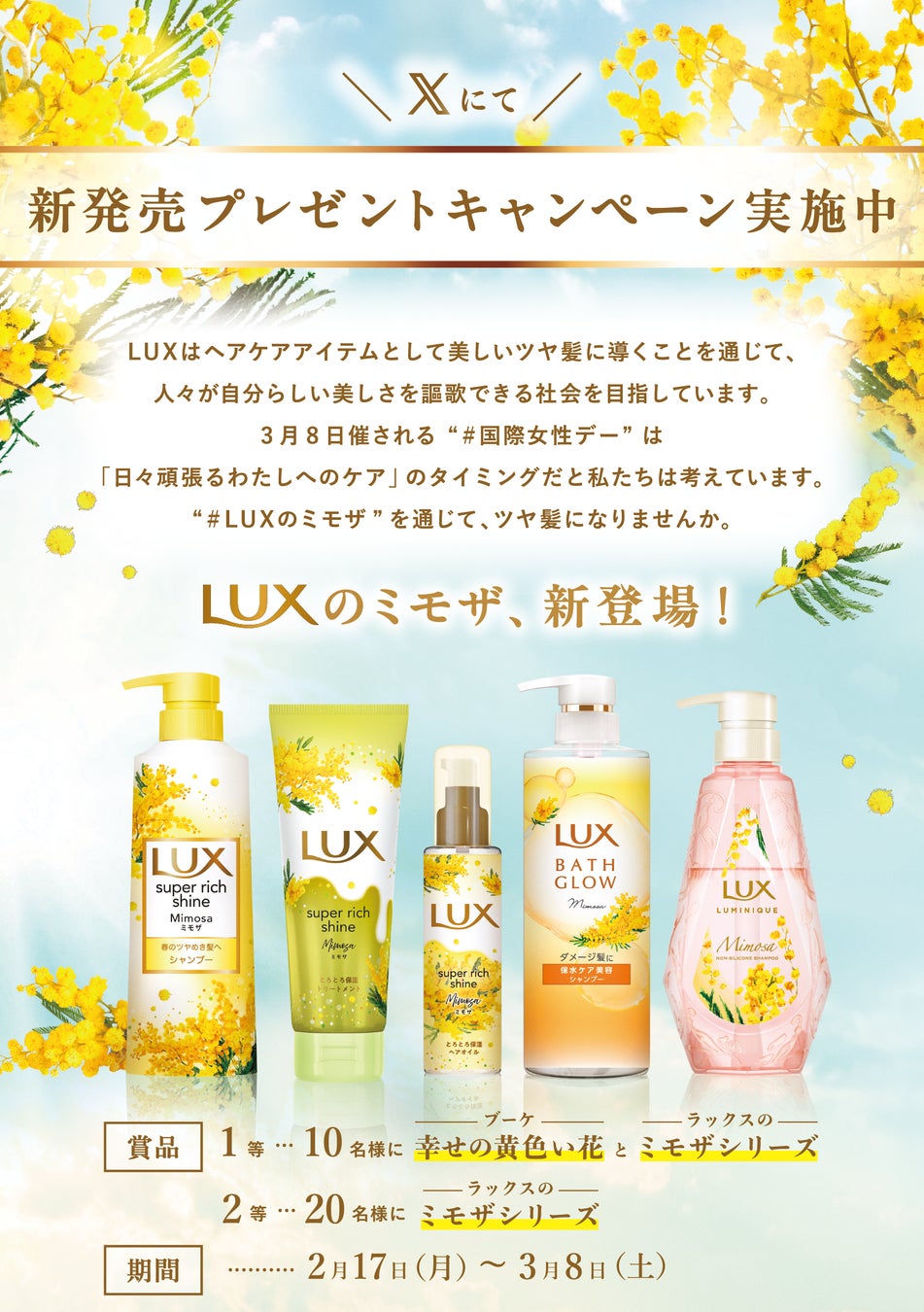 ユニリーバ・ジャパン・カスタマーマーケティング株式会社(本社:東京都目黒区、代表取締役 社長:エド・ブリオラ)が展開するトータルビューティーケアブランド「LUX(ラックス)」は、乾燥による冬の蓄積ダメージを保湿ケアし、ミモザ香るツヤ髪に導くラックスのミモザシリーズを、2025年2月17日(月)より数量限定で発売開始します。それに伴い、2025年3月8日(土)の“国際女性デー”に向けて、一般社団法人花の国日本協議会(以下、花の国日本協議会)とのコラボキャンペーンを2025年2月17日(月)18:00~2025年3月8日(土)23:59の期間にラックス公式X(@LuxOfficial)にて開催します。