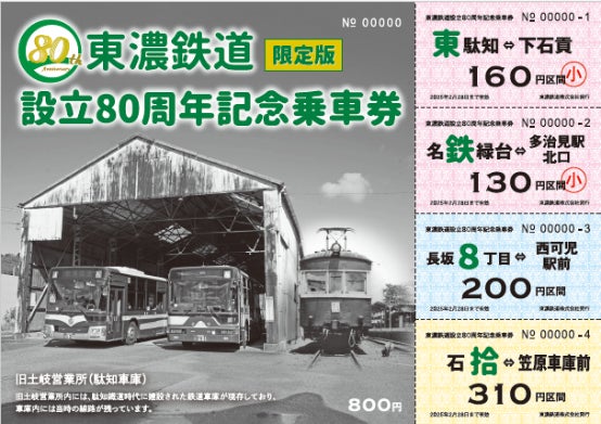 東濃鉄道株式会社(本社:多治見市栄町一丁目38番地、社長:今川孝英)では、3月1日に当社が設立80周年を迎えることを記念して、「設立80周年記念乗車券」の第一弾を発売します。