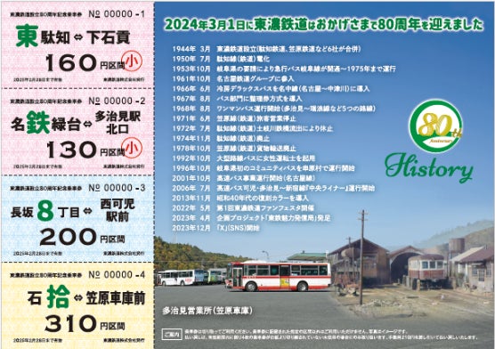 片道乗車券4枚が付いた台紙上に、表には旧土岐営業所(駄知車庫)にて駄知鉄道と現在の路線バス、裏には多治見営業所(笠原車庫)にて当時の笠原鉄道と現在の路線バス、当社の歴史を記載しており、歴史の移り変わりを感じることができるデザインとなっています。また、80周年を記念し、4枚の片道乗車券のそれぞれの区間のバス停名を一文字ずつ繋げると「東」「鉄」「8」「拾(じゅう)」となり、乗車券の合計金額は800円となります。モノクロ限定版(限定100セット)とカラー版の2種類を発売します。