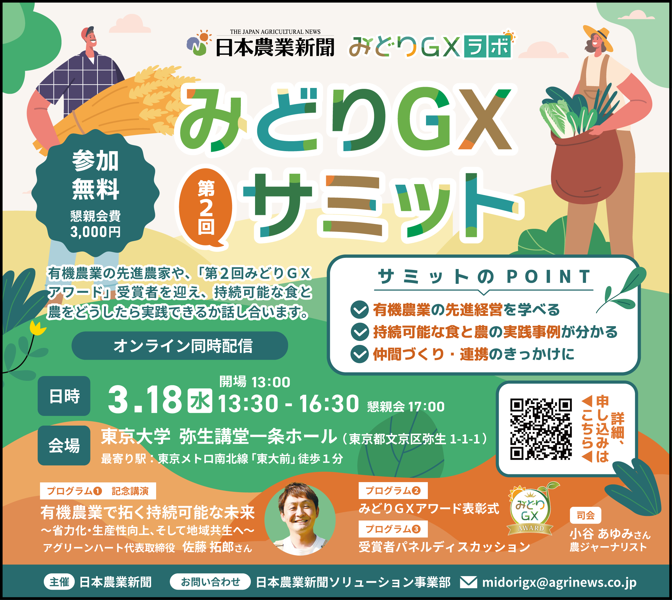 株式会社日本農業新聞(東京都台東区、代表取締役社長:田宮和史郎)は、持続可能な食と農の実現を目指すコンソーシアム「みどりGXラボ」の会員交流イベント「第2回みどりGXサミット」を、2026年3月18日(水)に東京都文京区の東京大学・弥生講堂で開きます。気候変動への対応や環境に配慮した農業に関心のある農家やJA、消費者、自治体、企業、研究者など多様な主体が全国から集結。有機農業を大規模・低コストに実践するアグリーンハート(青森県黒石市)の佐藤拓郎代表や、先進事例表彰「第2回みどりGXアワード」の受賞者を迎え、持続可能な食と農を行動に移す方法を探ります。