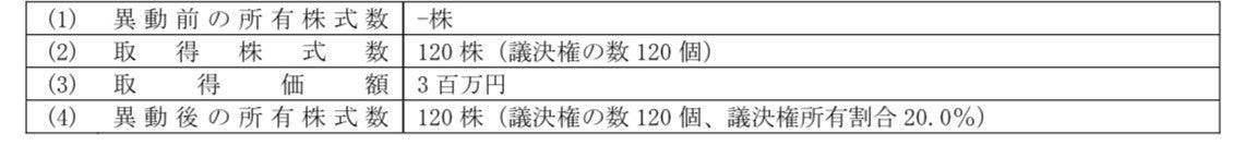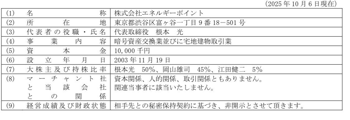 2025 年10 月7 日付で、第三者割当の方法により、マーチャント社がエネルギーポイント社の普通株式120 株(第三者割当後の発行済株式総数に対する所有割合20.0%)を取得します。取得価額は3 百万円(1 株当たり25,000 円)になります。