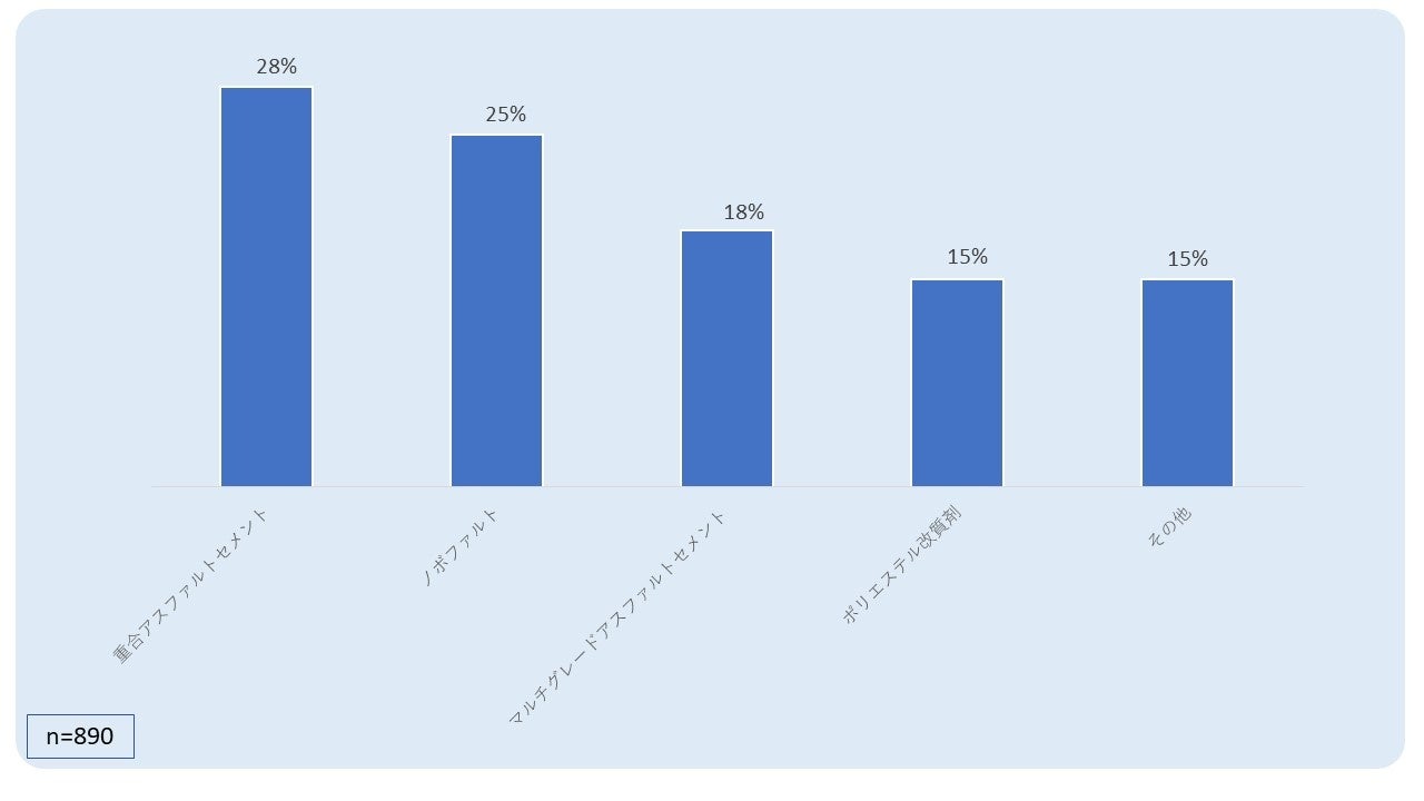 - 自社が主に使用するアスファルト添加剤の種類では、重合アスファルトセメントが回答者の 28.1% でトップとなり、次いでノボファルト」(24.7%)がわずかな差で続きます。 マルチグレードアスファルトセメントとポリエステル改質剤それぞれ18%と14.6%と同程度のシェアを占め、その他のタイプが残りの 14.6% を占めています。