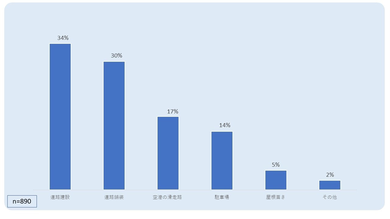 - アスファルト添加剤のアプリケーションに関しては、道路建設が最も多く、回答者の 33.7% が主にこの分野でアスファルト添加剤を使用しています。 次いで道路舗装が29.2%、空港滑走路が16.9%で続きました。 駐車場は13.5%、屋根は4.5%、その他のアプリケーションは 2.2% を占めました。