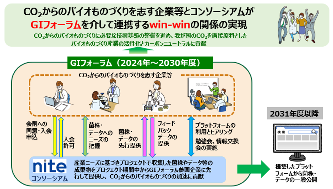 今般、NITEは、NEDO及びコンソーシアム参加7機関の協力を得て、CO2からのバイオものづくりを志す企業とコンソーシアムが早期から緊密に連携するための新たな共同体「グリーンイノベーションフォーラム(GIフォーラム)」(図2)を立ち上げます。