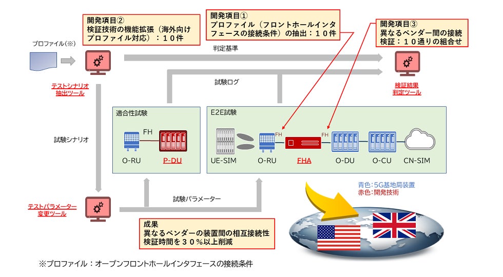 こうした背景を踏まえ、NEDO(国立研究開発法人新エネルギー・産業技術総合開発機構)が実施する本事業※2において、日本電気株式会社(以下、NEC)と富士通株式会社(以下、富士通)は、O-RAN市場として期待される英国と北米で検証環境を構築してきました。そして2021年8月から2023年6月まで、NECの英国の拠点と富士通の米国の拠点において、海外を含めたさまざまなオペレーターが実際の商用環境で使用するプロファイル※3や基地局装置ベンダーの組み合わせで動作検証を行い、異なるベンダーの基地局装置(O-RAN仕様準拠)間の相互接続性の検証作業の効率化を実現する技術の開発に取り組みました。
