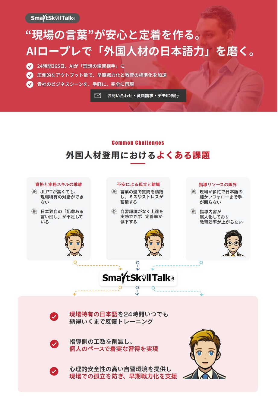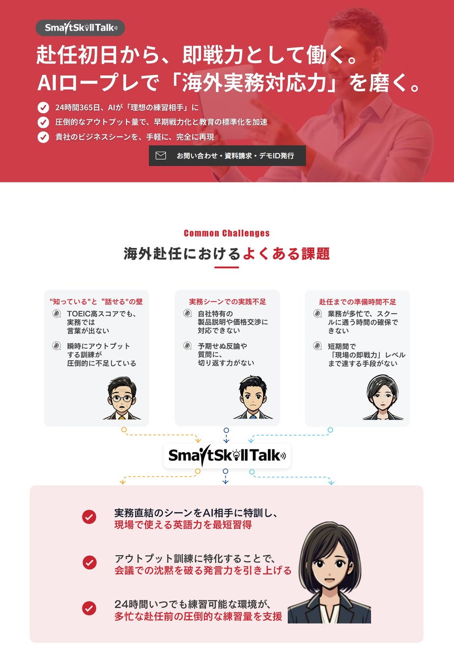 今回のサイトリニューアルでは、多様化するニーズに応えるべく「営業力強化」「マネジメント層のコミュニケーション力強化」「外国人材の日本語対応力向上」「海外赴任者の英語対応力向上」の4つのソリューション別に、SmartSkill Talkの活用法を公開。
