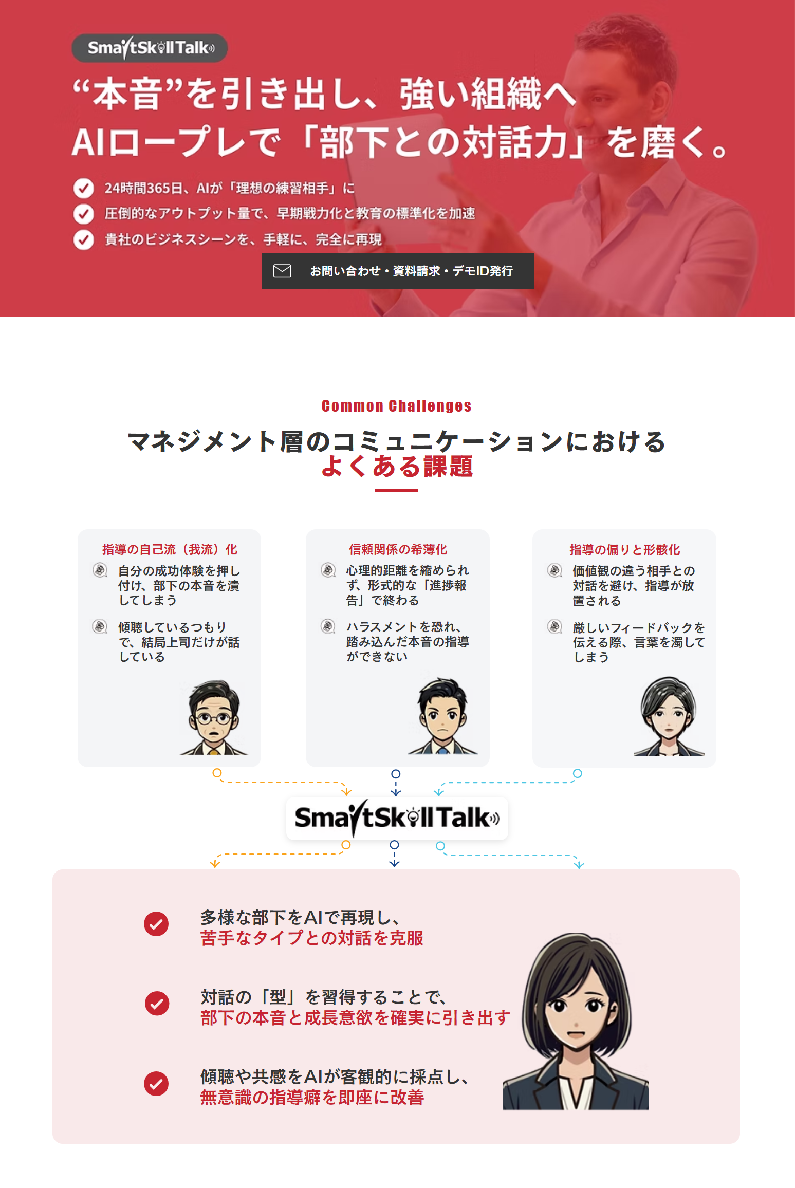 これらの課題を解決するため、SmartSkill Talkは「いつでも・どこでも・何度でも」AIが「理想の練習相手」となり、セルフトレーニングで成長実感しながら、実践で使える対話力を磨きます。
