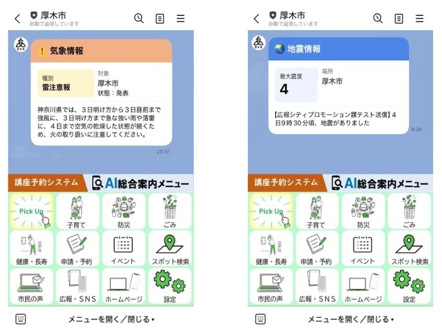 気象庁の防災情報と連携し、地震・気象警報をLINEから