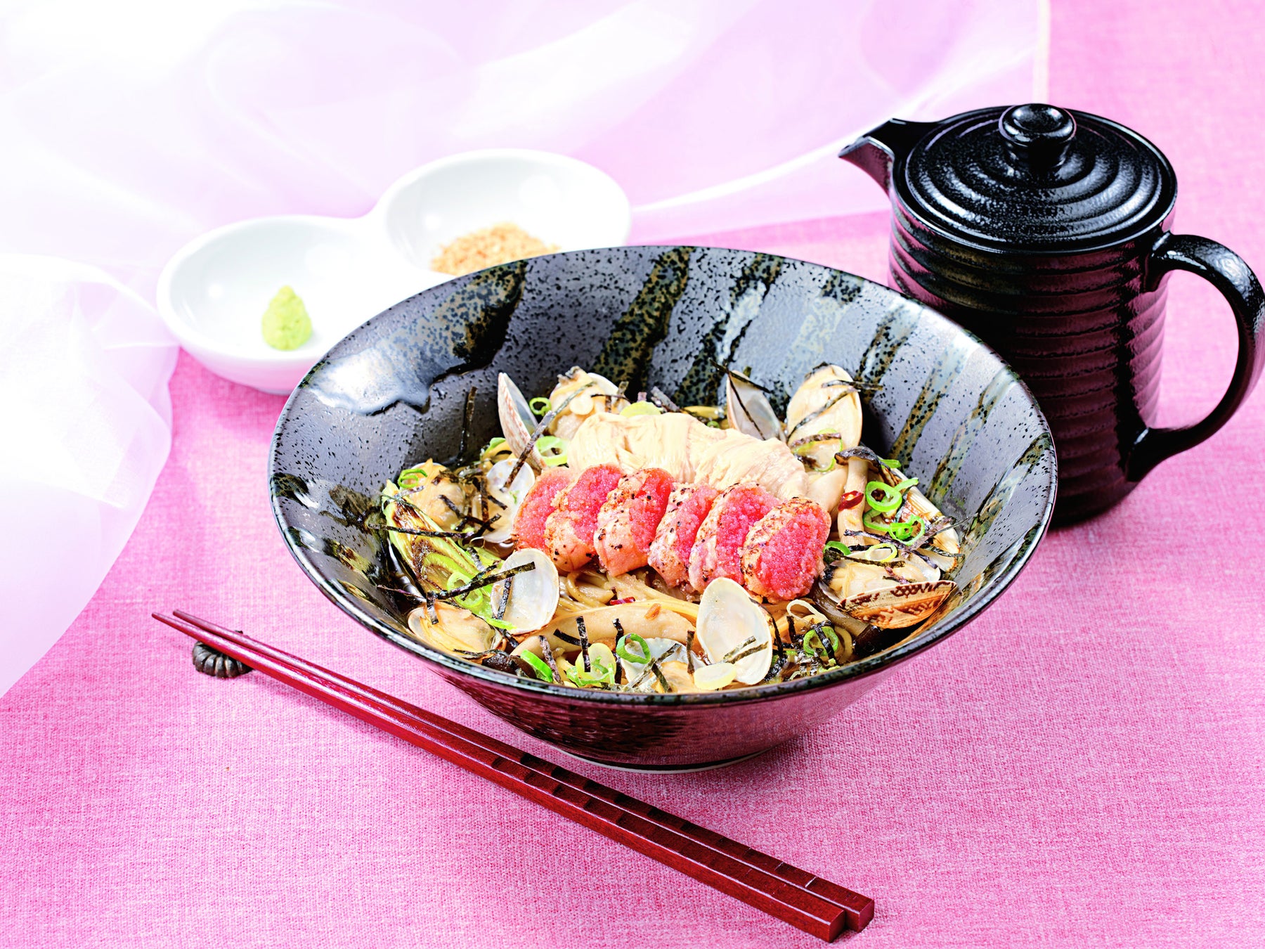 やさしい味わいの生湯葉、旨みたっぷりの炙りタラコとアサリを合わせた和風パスタに、温かいお出汁をセットにした、2度おいしい一品です。和風あんが絡んだ生湯葉を口に入れると、クリーミーな湯葉がとろ~りとろけます。パスタは、醬油ベースのパスタソースに香ばしい焼きネギとフライドガーリックを加え、コクのある味わいに仕上げました。途中で上品な風味のお出汁をかけると、炙りタラコをはじめとした濃厚な味わいが、マイルドに変化します。お好みで別添えのわさびを合わせて爽やかに、すりごまを加えて香ばしく、お出汁の味を変化させてお召し上がりください。