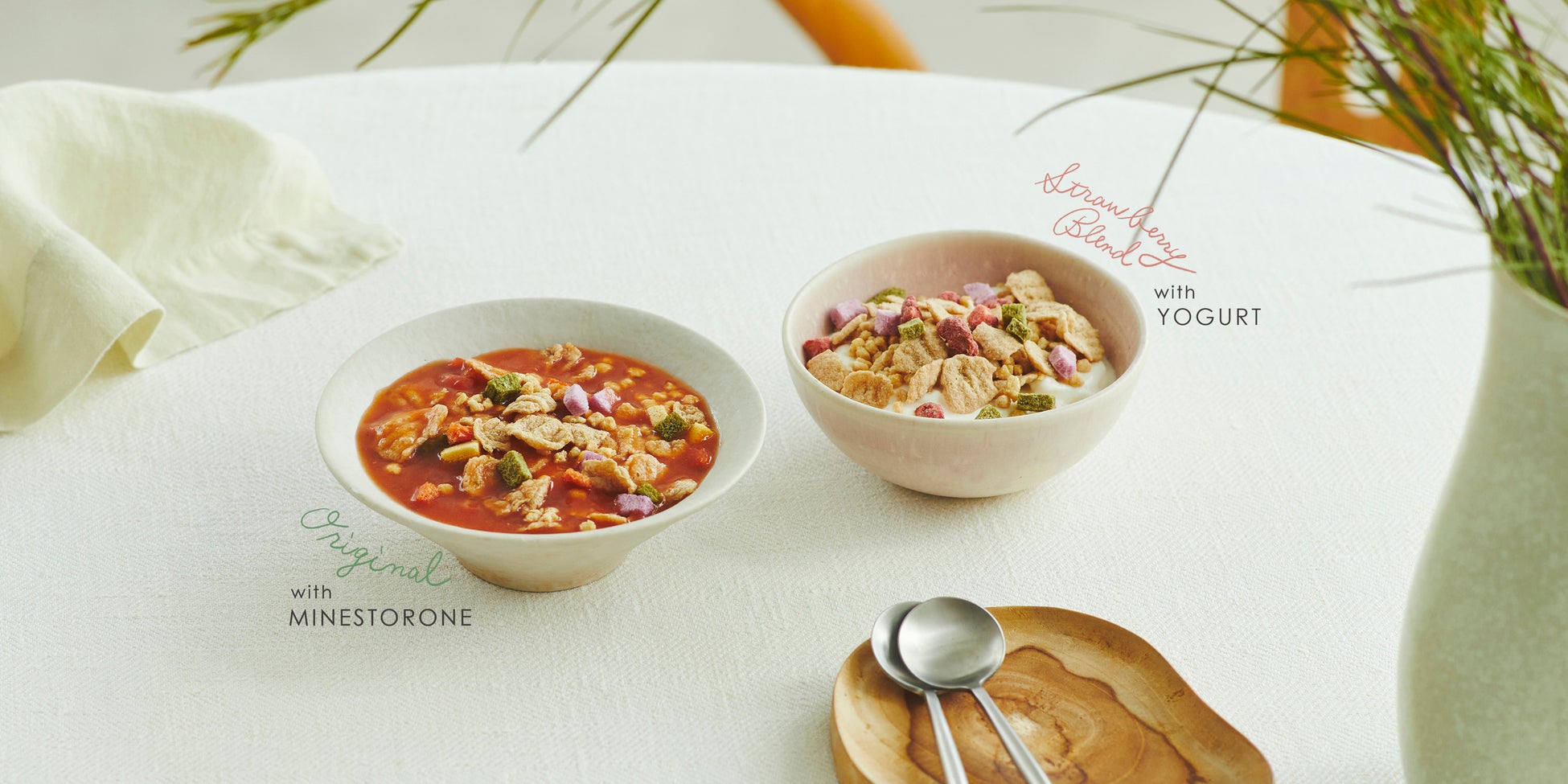 ◇ 2種の大豆フレークと2色の野菜キューブ(ほうれん草、紫いも&ビート)に加え、いちごのキューブ※を使用。※ いちご等を加工し、固めたものです。