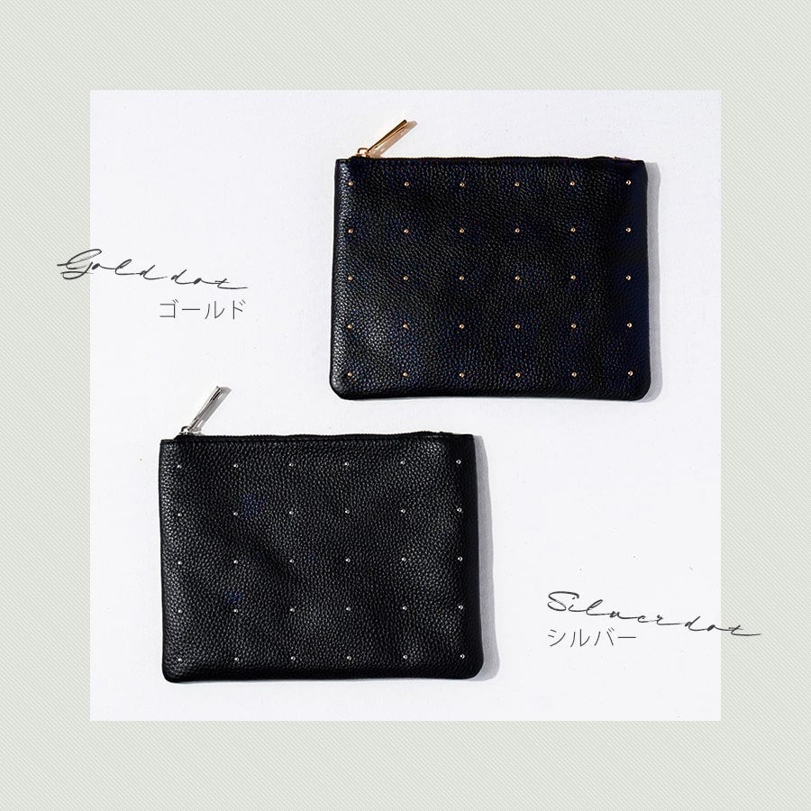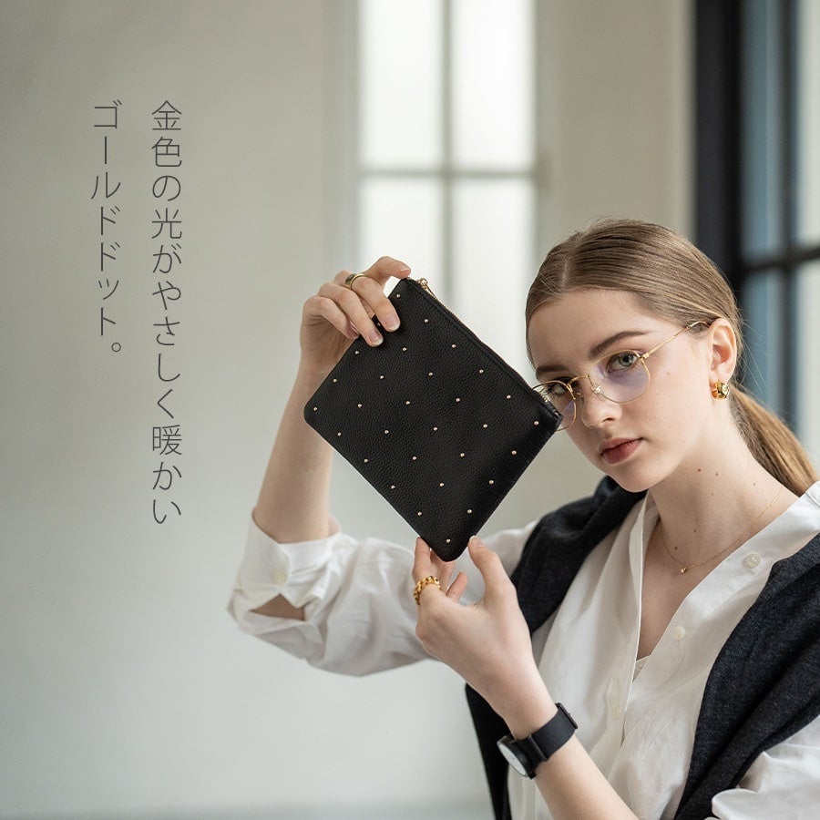 やさしく暖かい金の星のようなドットがきらめく本革ポーチ。
