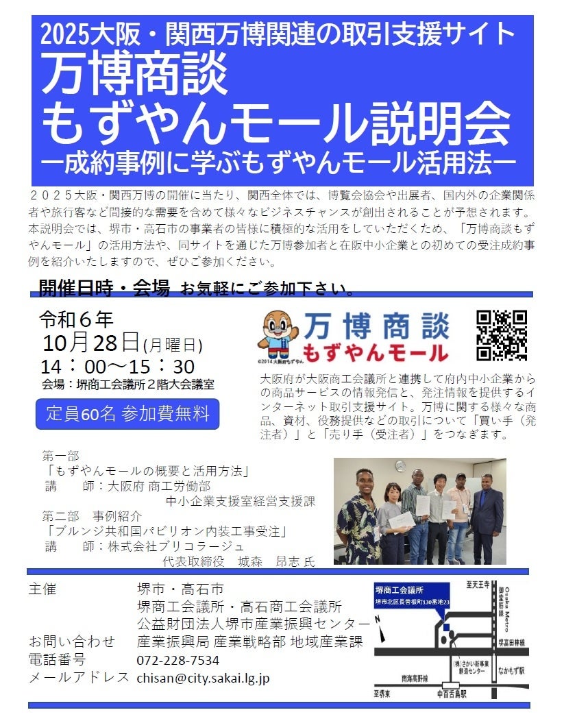 堺市と高石市では、地域の支援機関である堺商工会議所、高石商工会議所、公益財団法人堺市産業振興センターと共催で、「万博商談もずやんモール説明会」を開催します。