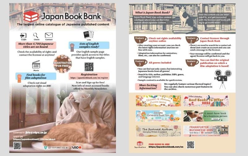一般社団法人日本書籍出版協会とVIPOが共同で運営する、日本の出版コンテンツを日・英で検索できるオンラインカタログサイト「Japan Book Bank」では、フランクフルト・ブックフェアにて登録書籍の紹介、ID登録の促進を実施します。
