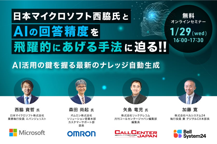 株式会社ベルシステム24(本社:東京都港区、代表取締役 社長執行役員:梶原 浩、以下:ベルシステム24)は、コンタクトセンターを運営する企業向けに、「日本マイクロソフト西脇氏とAIの回答精度を飛躍的にあげる手法に迫る‼~AI活用の鍵を握る最新のナレッジ自動生成~」と題したオンラインセミナーを、1月29日(水)に開催します。