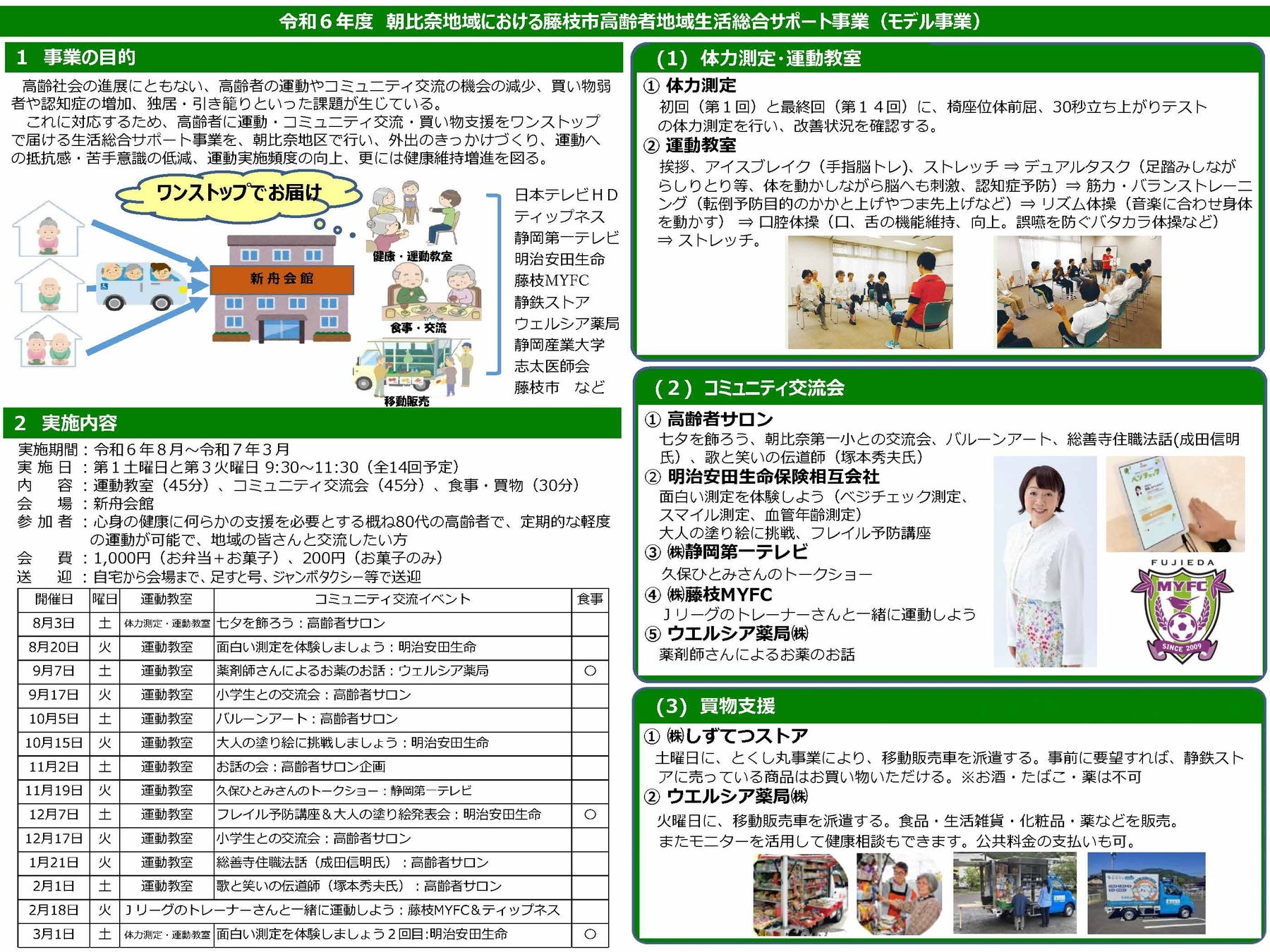 ・運動教室、交流イベント、買い物支援などを地域の高齢者サロン、明治安田生命、藤枝MYFC、静岡第一テレビ、日本テレビホールディングス、ティップネス、静岡産業大学、志太医師会、ウエルシア薬局、しずてつストアなど産学連携してワンストップでお届けします。