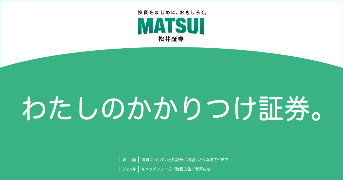 松井証券株式会社(本社:東京都千代田区、代表取締役社長:和里田 聰、以下「当社」)は、日本最大級の公募広告賞である第62回「宣伝会議賞」(主催:株式会社宣伝会議)にて、「投資について、松井証券に相談したくなるアイデア」を一般募集し、多数の応募作品の中から協賛企業賞を「わたしのかかりつけ証券。」に決定しました。