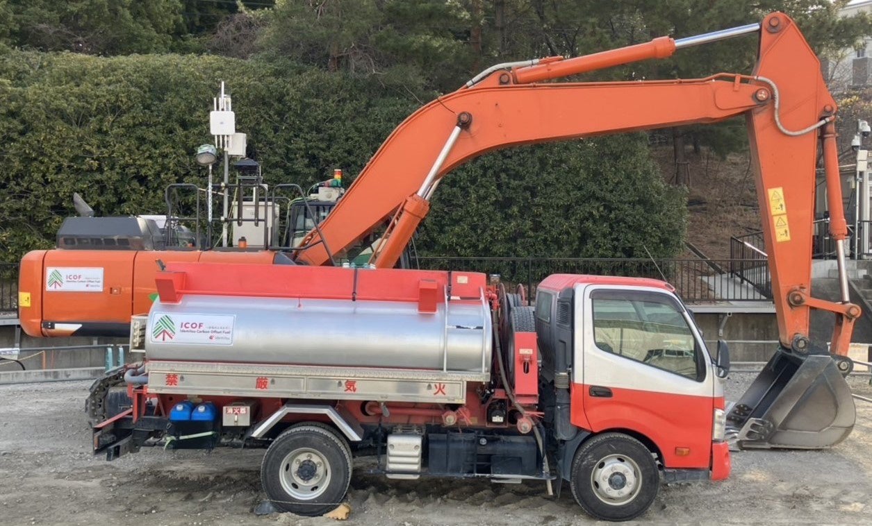 こうした状況を踏まえ、大林組では、CO2排出量の削減に向けた継続的な取り組みを前提としつつ、出光興産が建設業界などカーボンニュートラルへ挑戦する企業向けに供給をしているICOFJをはじめとしたカーボン・オフセットの活用について検討を進めてきました。ICOFJには、J-クレジット制度に基づいて認証されたクレジットが付与されており、通常の燃料と同様に建設現場をはじめとするさまざまな場所で使用することが可能です。両社は、2024年から行っている次世代バイオ燃料「出光リニューアブルディーゼル(IRD)」(※5)の実証において連携をしており、今回のICOFJ使用の取り組みは、この連携をさらに発展させたものです。