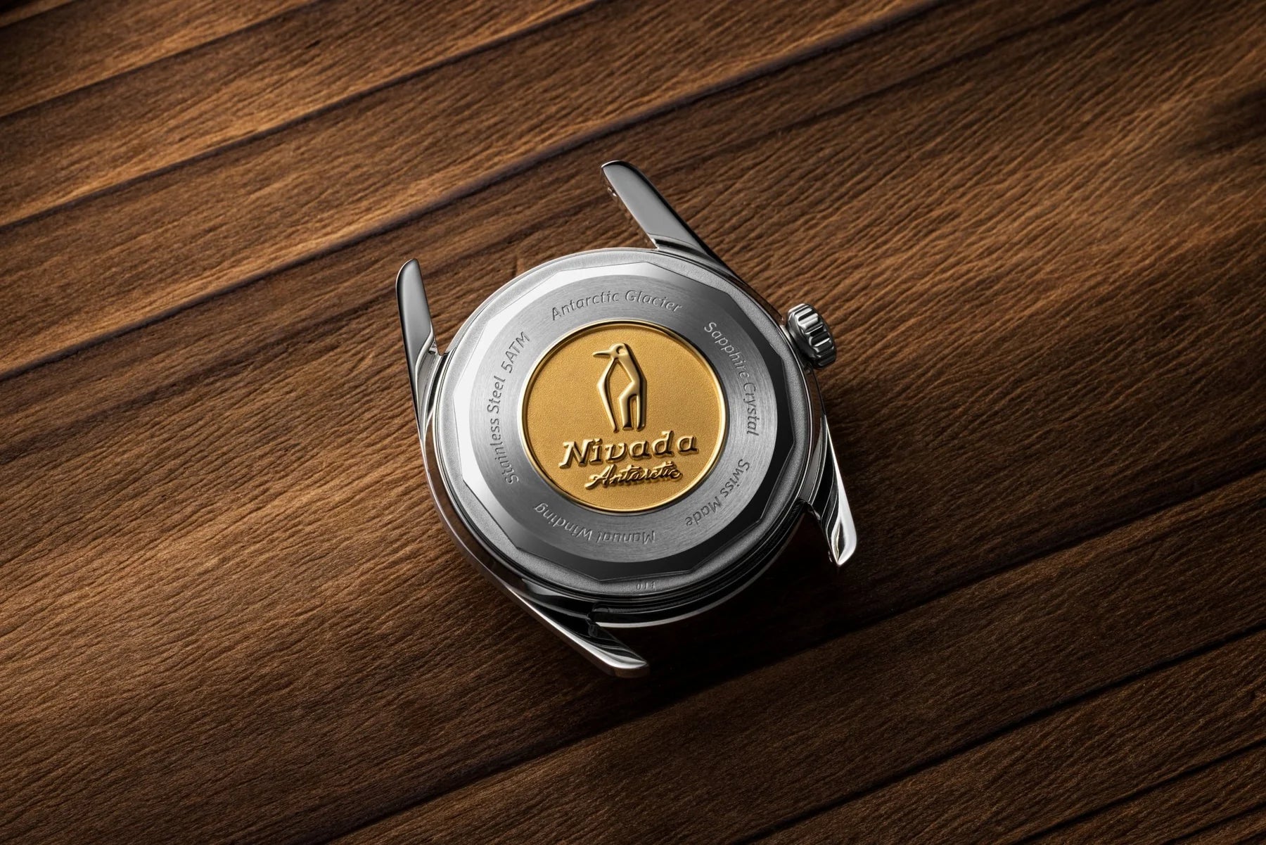 縦方向のブラッシュ仕上げを施したシルバーダイヤルは、氷河の柔らかな光を思わせる静謐な表情を演出します。外周に配したアンスラサイトカラーのリングが上品なコントラストを生み、視認性と奥行きを向上。この2トーンの構成は“タキシードダイヤル”として知られ、クラシックな洗練を象徴する意匠です。ケースバックには、ニバダ・グレンヒェンの極地探検の歴史を象徴する“ペンギンメダリオン”を刻印し、ブランドの物語をさりげなく刻み込みました。