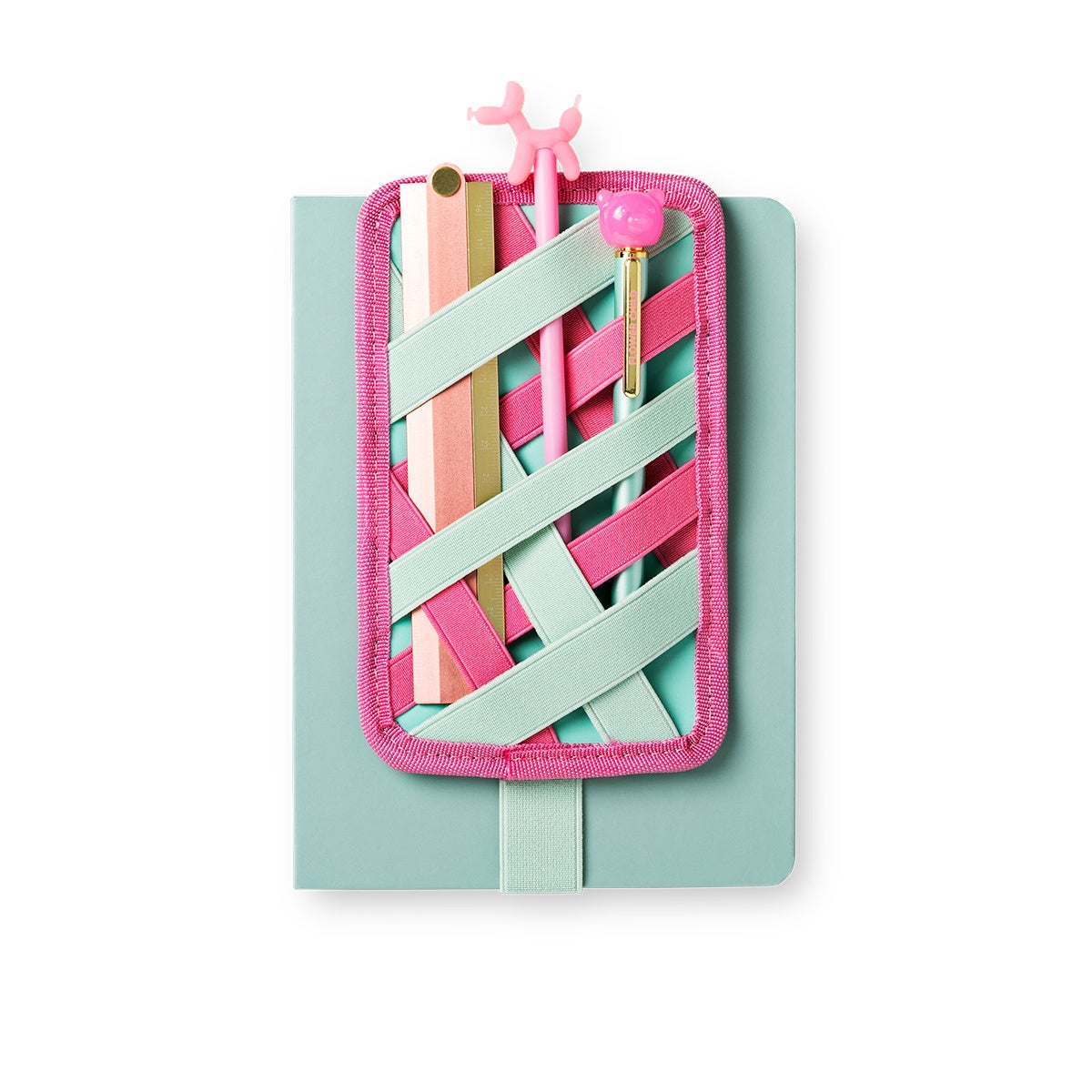 ゴムの間にペンや定規の文房具を挟んで持ち運べます。背面には、ノートや本にくっつけることができるバンド付き。ペンケース要らず。