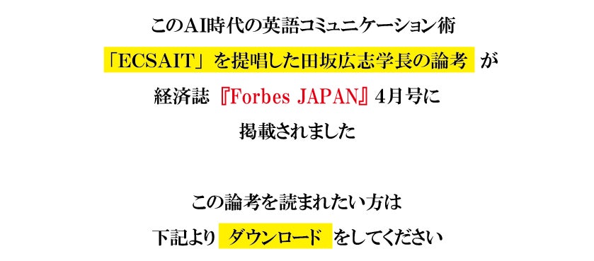 田坂広志学長が経済誌「Forbes Japan」に寄稿。AI時代の英語コミュニケーション術「ECSAIT」を提言。本学園では1万名の学生が実践。英語が話せないのに、海外と交渉できる「英語新人類」とは?