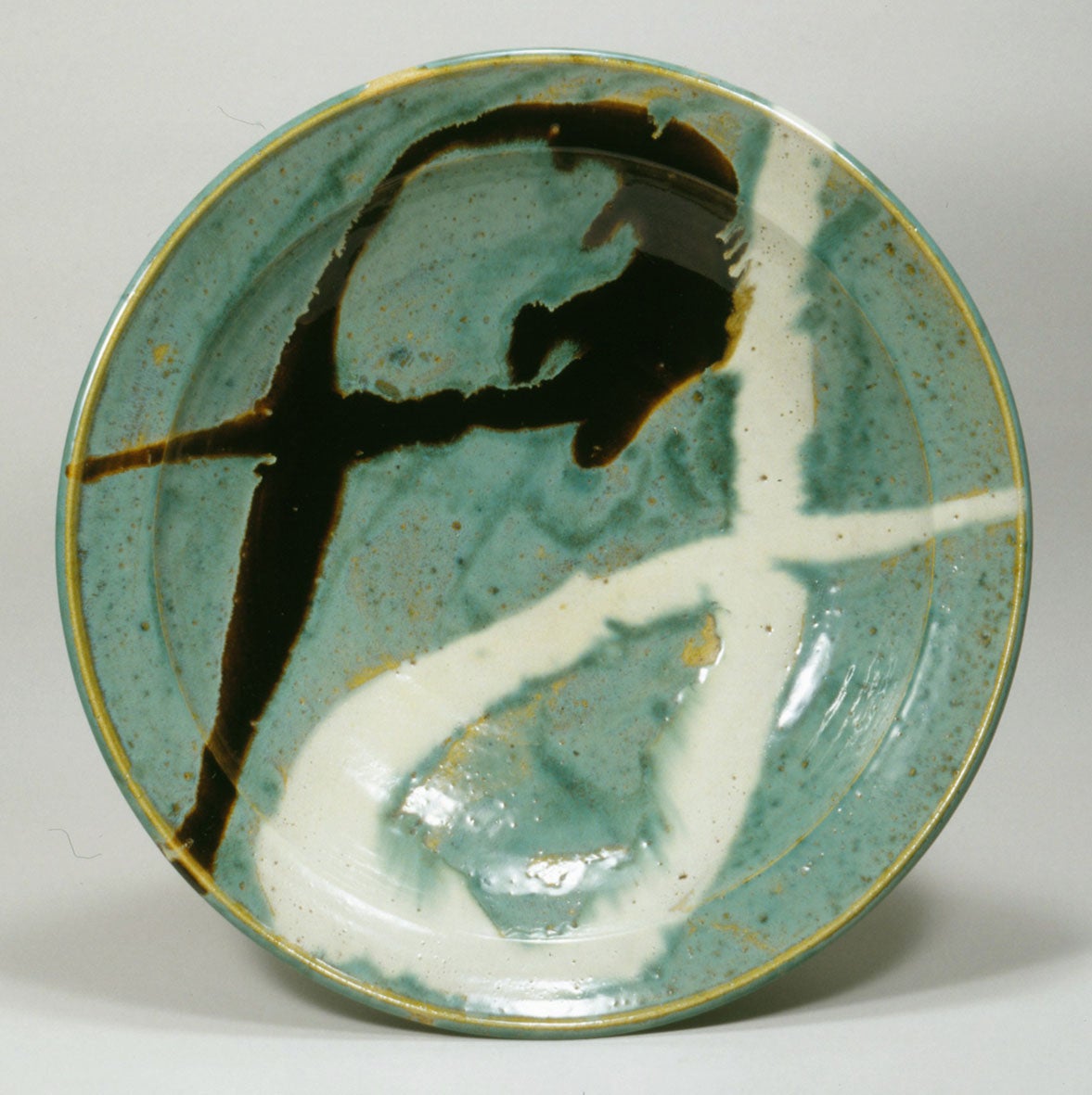 緑色の青釉の上に、黒褐色の釉薬と白濁した釉薬が、円を結ぶように柄杓で流し掛けられています。濱田は、日本各地の窯で用いられた技法を、力強く昇華させており、手の動きがそのまま投影された文様は、躍動感に満ちています。