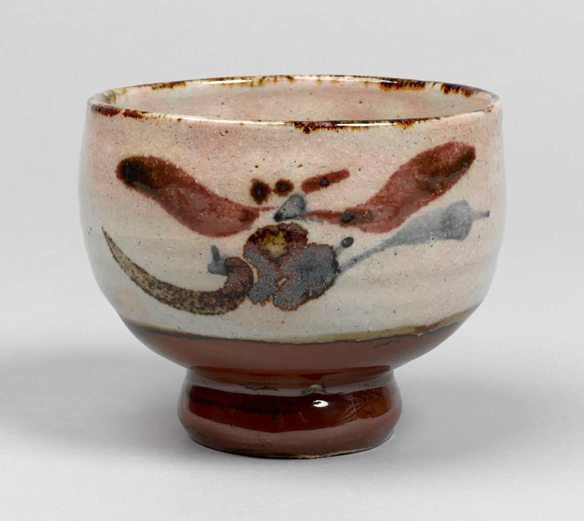 河井寬次郎(かわいかんじろう)は、柳宗悦・濱田庄司とともに民藝運動を主導した陶芸家です。昭和戦前期以降、河井は褐色の鉄絵、赤紫色の辰砂(しんしゃ)・青い染付の顔料を用い、伸びやかな筆致で草花文を器に描きました。
