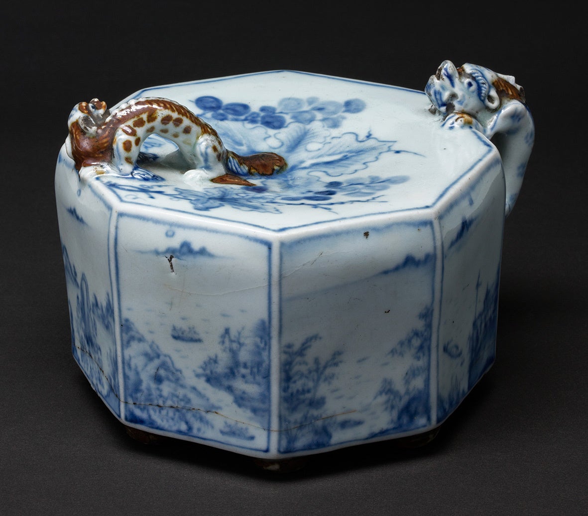 青花鉄砂葡萄山水文八角形水滴「癸卯六月日分院」銘(せいかてっしゃぶどうさんすいもんはっかくけいすいてき きぼうろくがつひぶんいん めい)