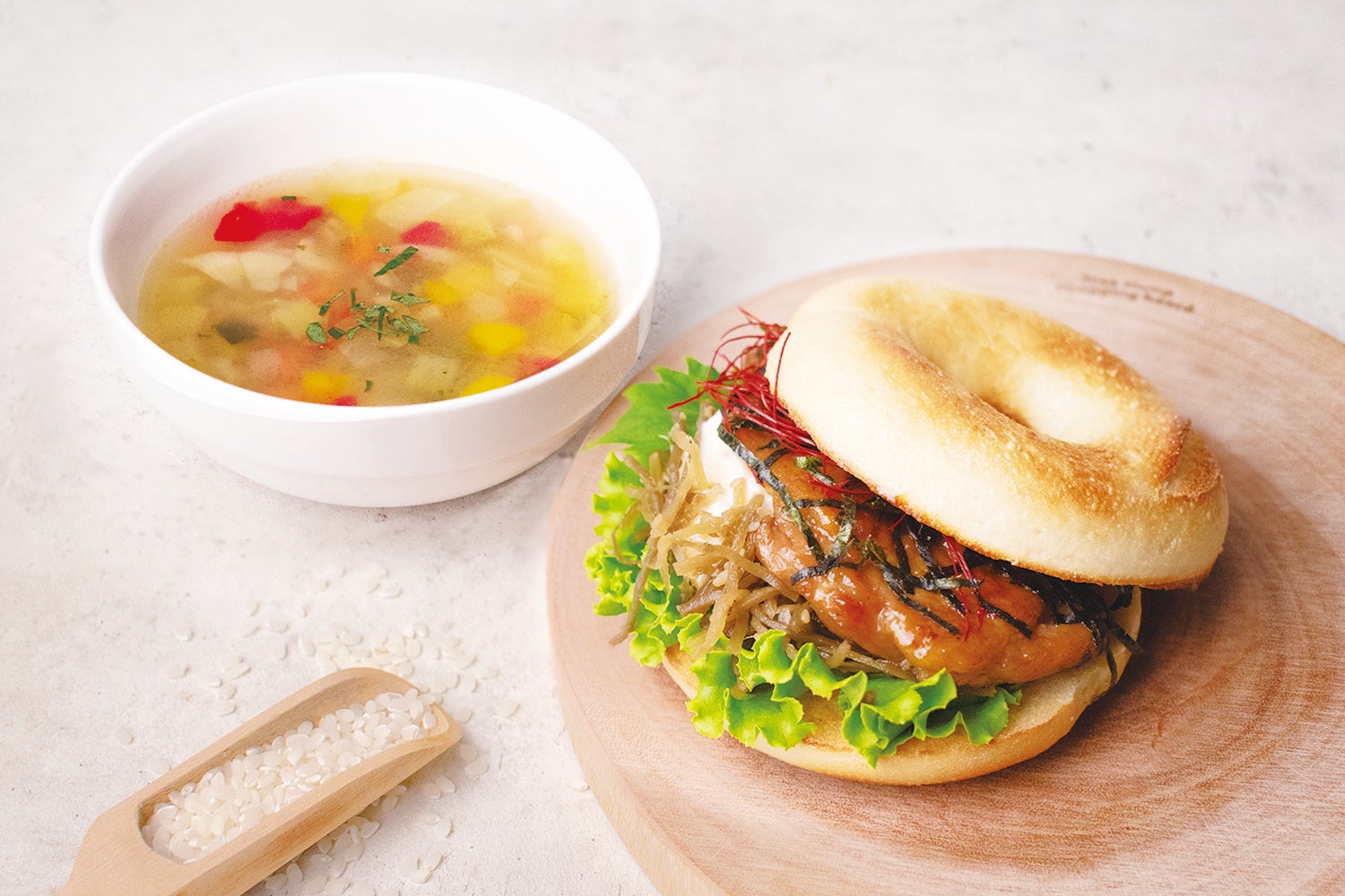 米粉ベーグルの美味しさを再発見できる和素材をあわせた『米・米粉消費拡大推進プロジェクト』限定サンドイッチと塩糀を使用した優しい味わいのカラダ温まるスープのセットです。