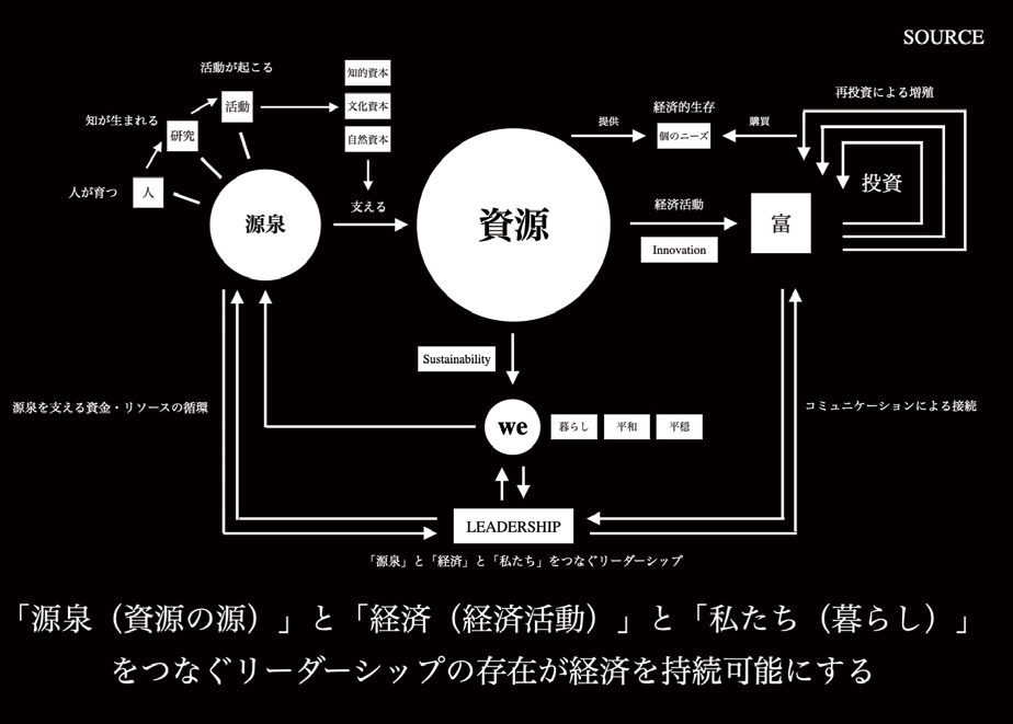 ミラツクは、この源泉を支える4つの資本を目に見える形で示し、その存在を認識し、敬意を払い、その結果生まれる一回り拡張された経済の循環が当たり前となる社会の実現を目指します。その際、「源泉」と「資源」、「私たち(暮らし)」をつなぎ、世界の再建に貢献するリーダーシップの存在が鍵を握ると考えます。