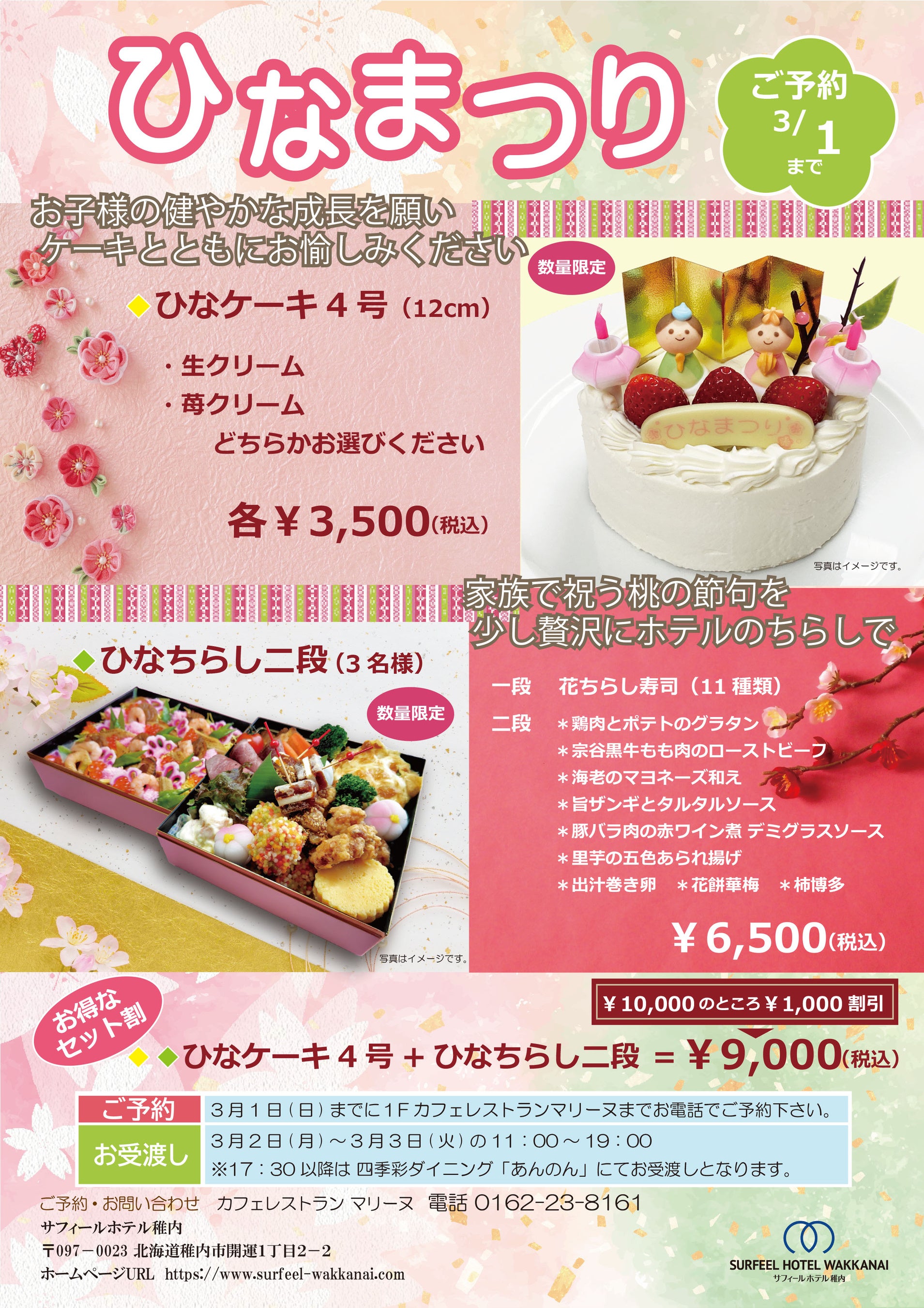 【サフィールホテル稚内】ひなまつり限定「ひなケーキ」&「ひなちらし二段重」ご予約受付開始
