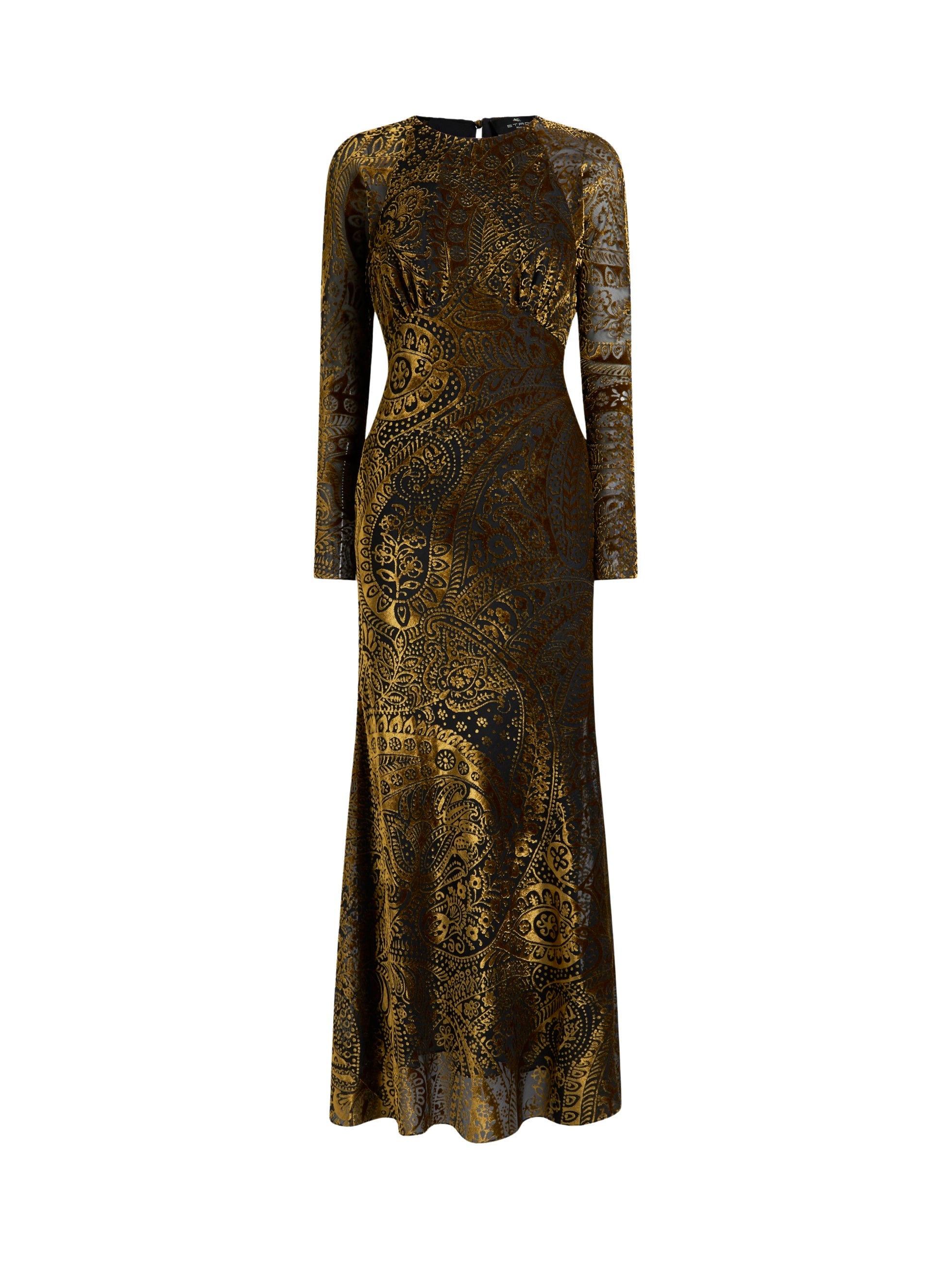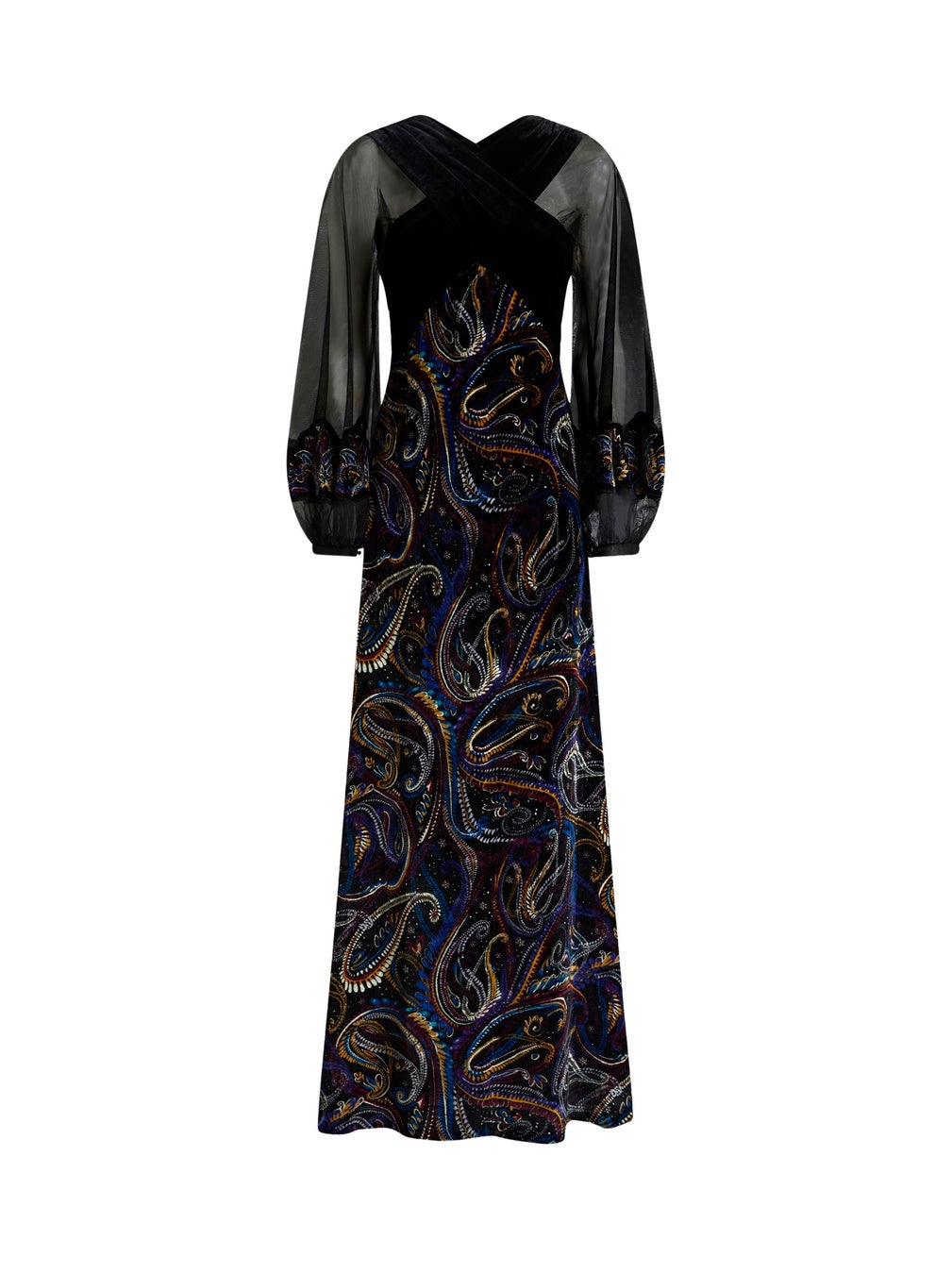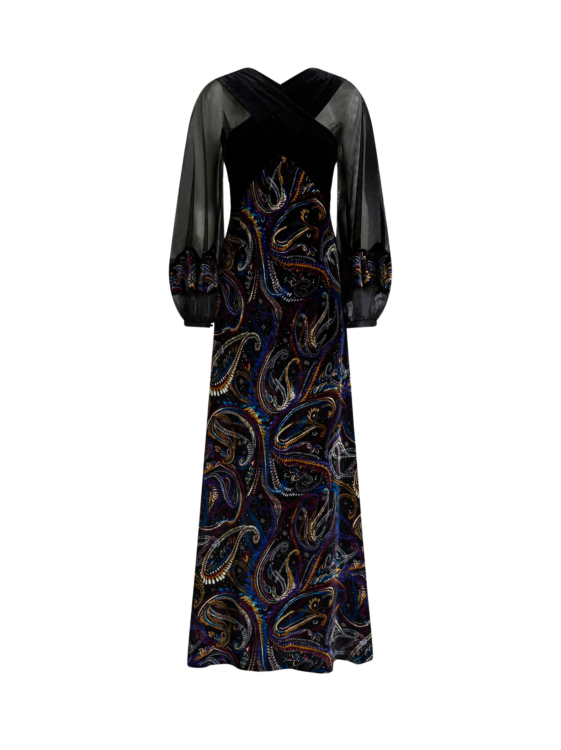ペイズリー柄は宝石のように美しい色彩で表現され、ベルベットやシルクのドレープがしなやかに身体を包みます。レースやフリル、煌めく糸が織りなす柔らかなテキスタイルの魔法は、洗練された刺繍やジャカードのモチーフによってさらにその魅力を深めています。