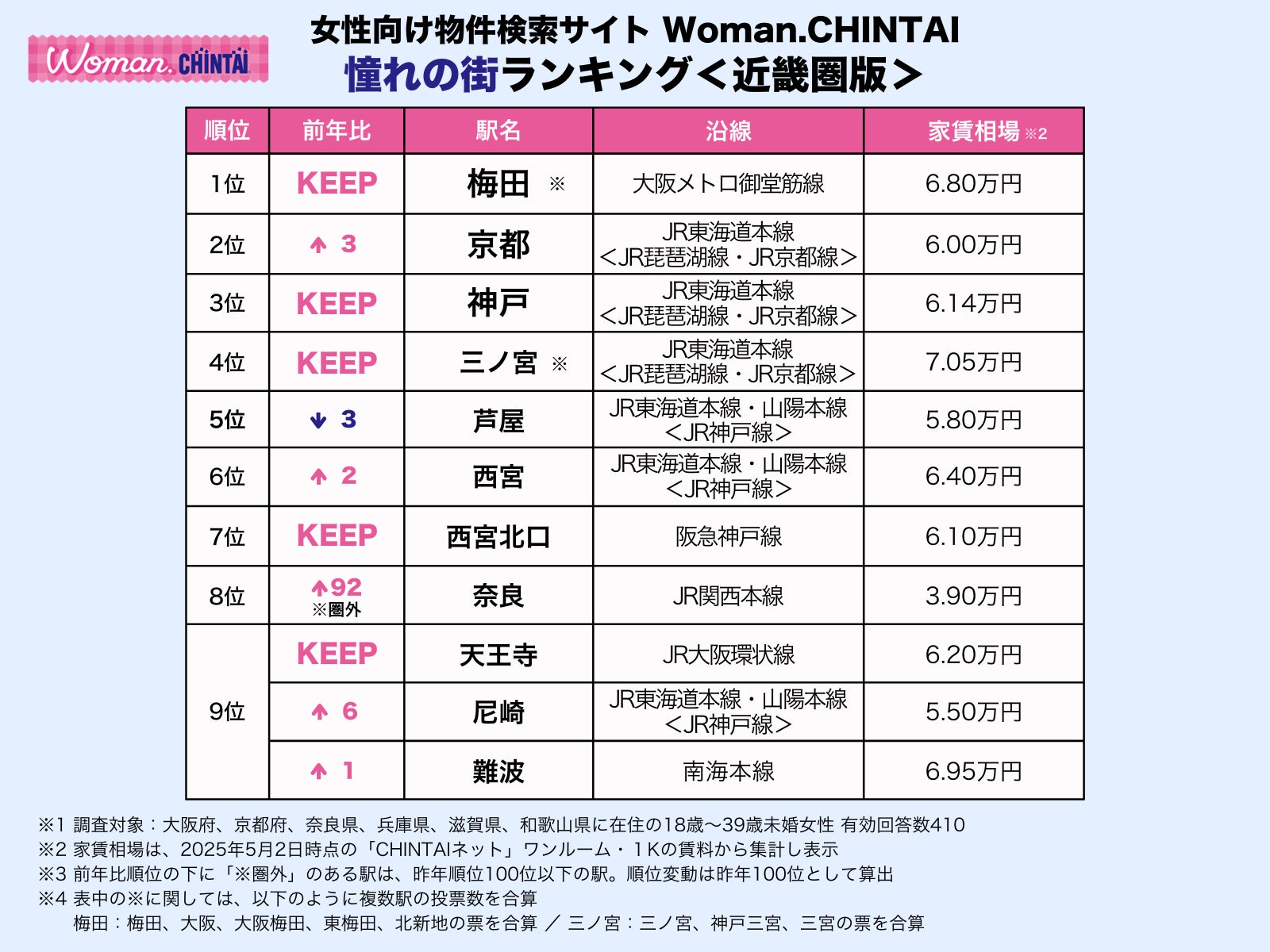 お部屋探しのリーディングカンパニー、株式会社CHINTAI(本社:東京都港区、代表取締役社長 奥田倫也)は、女性向け賃貸物件検索サイト『Woman.CHINTAI』に掲載された賃貸物件のうち、近畿圏エリア(大阪府、京都府、奈良県、兵庫県、滋賀県、和歌山県)のお問合せ数を集計した「住みたい街ランキング2025 近畿圏版」を発表します。さらに、近畿圏在住の18歳~39歳の未婚女性を対象に、近畿圏で一度は住んでみたい憧れの街を調査し、ランキング化しました。