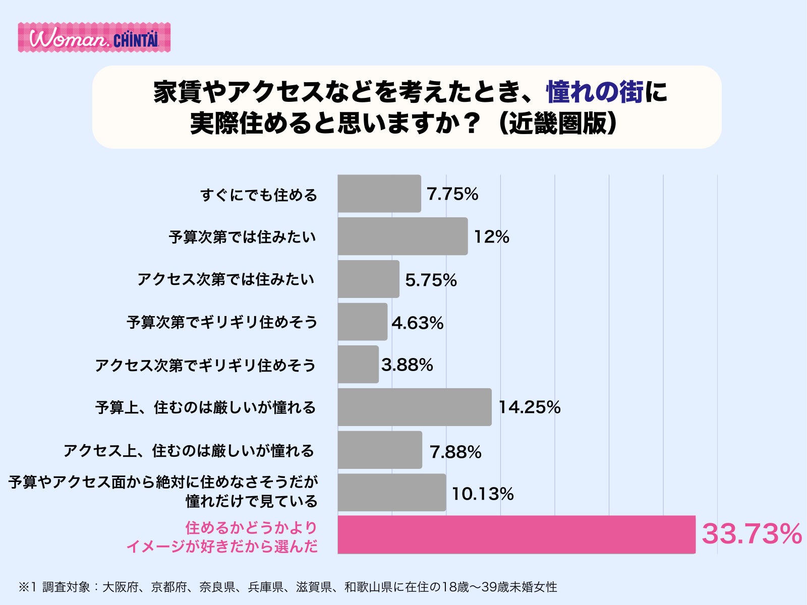 最も多かった回答は、「住めるかどうかよりイメージが好きだから選んだ」(33.73%)で、全体の約3分の1を占めました。さらに、「予算上、住むのは厳しいが憧れる」(14.25%)、「アクセス上、住むのは厳しいが憧れる」(7.88%)、「予算やアクセス面から絶対に住めなさそうだが、憧れだけで見ている」(10.13%)をあわせると、約66%の女性が“住む現実”とは切り離していることがわかります。この結果から、家賃や通勤利便性といった現実的な条件よりも、その街に抱く印象やイメージが、憧れの基準になっている傾向が浮き彫りとなりました。