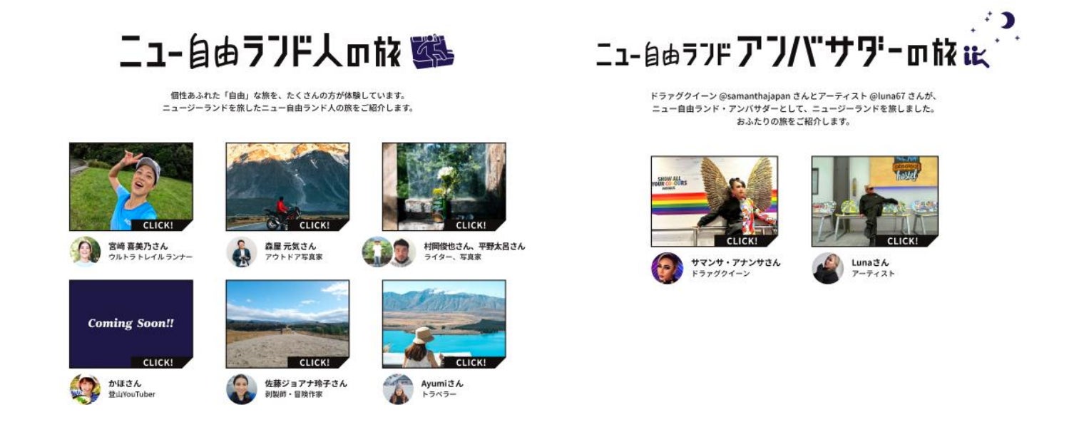 さらに、ドラァグクイーンのサマンサ・アナンサさん、アーティストのLUNAさんも「ニュー自由ランドアンバサダー」としてニュージーランドの旅を慣行。お二人が真のダイバーシティを感じたという旅の様子を楽しめる動画は必見です。