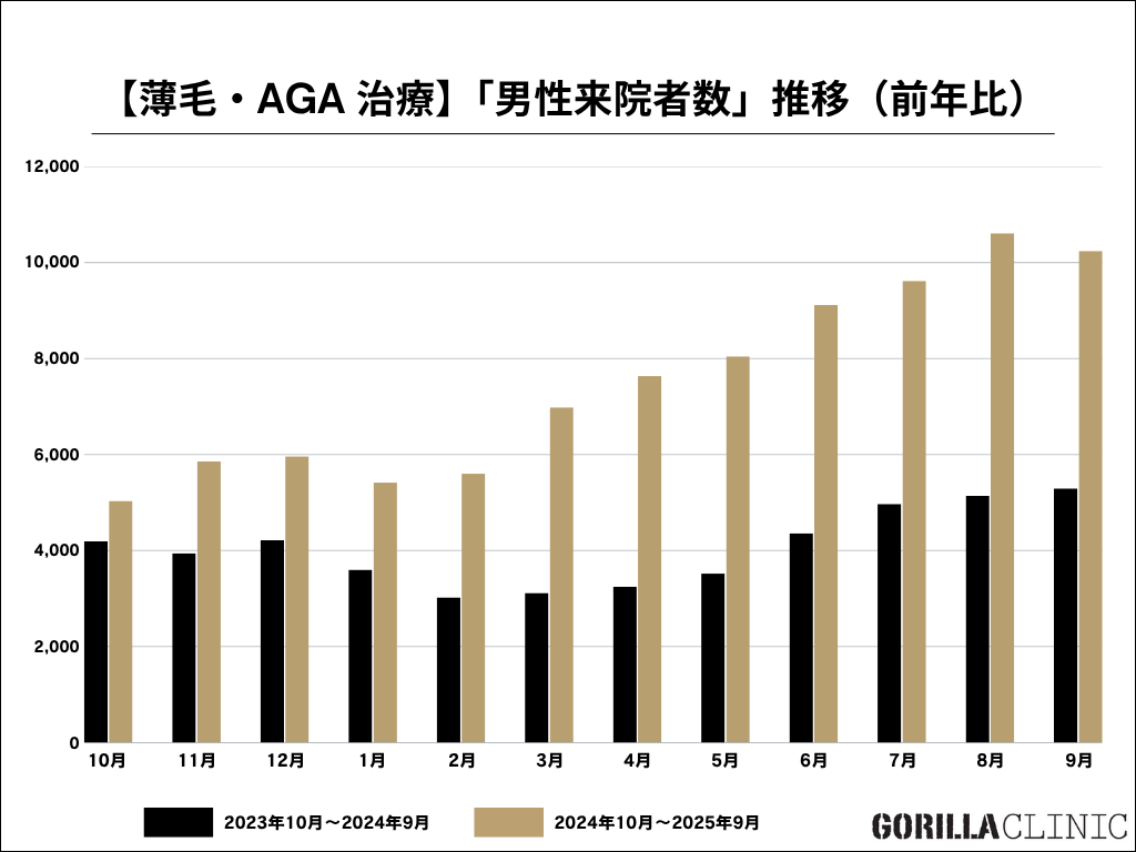 当院における【「薄毛・AGA治療」希望の男性来院者数】は「昨年度(2023年10月1日~翌年9月30日)」と「今年度(2024年10月1日~翌年9月30日)」を比較すると前年比1.85倍(約2倍)と大幅に増加。今年8月・9月のピーク時はそれぞれ月間1万人を突破し過去最高値を更新するなど、早期から“予防的治療”を目的に医療機関を利用する男性の需要が拡大しています。