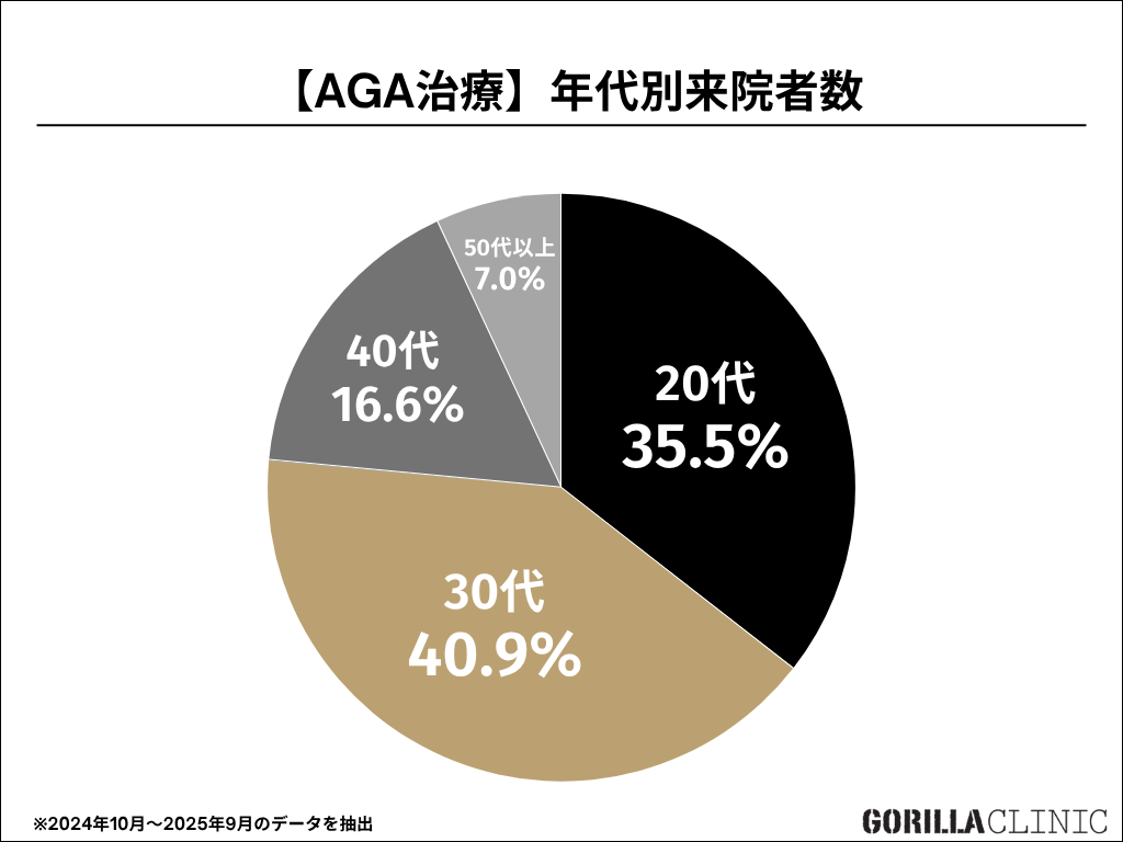 20代・30代はAGAの症状を自覚し始めることの多い年代です。そして、「同年代の知人と比較して薄毛が進行している」、「年々症状が増悪してきている」ということから不安を感じやすいです。