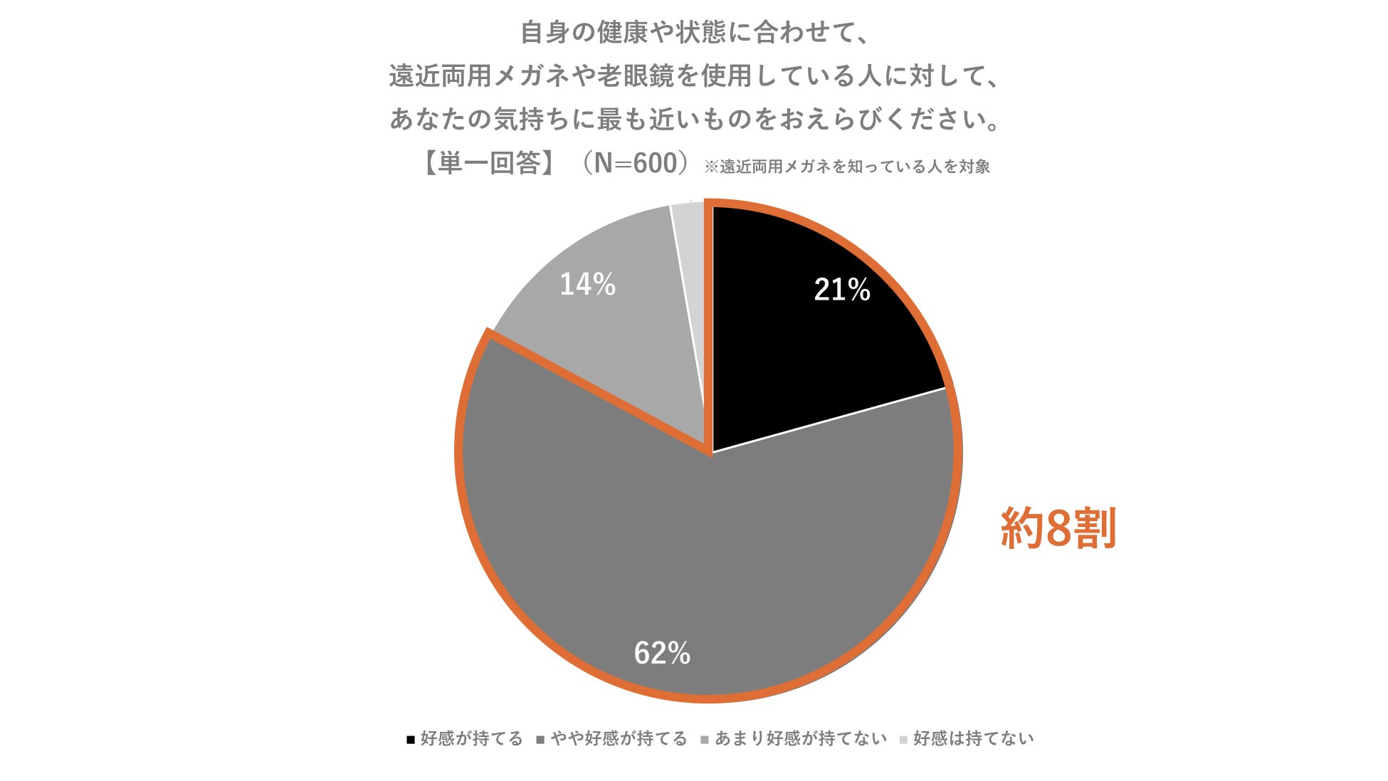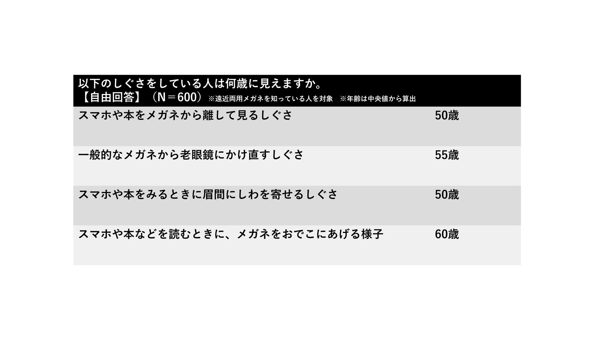 「スマホや本を目から話して見るしぐさ」、「スマホや本を見るときに眉間に皺を寄せるしぐさ」など、老眼を我慢しているしぐさは50歳に見えることが判明しました。また、自分の健康や状態に合わせて、遠近両用メガネや老眼鏡を使用している人に対して、約8割の人が好感を持てると回答しており、老眼を我慢せずに遠近両用メガネを着用する方が良い傾向に。