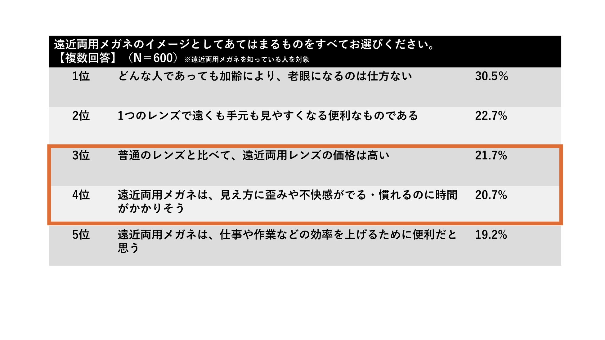 40代で遠近両用メガネを持っていない理由は、「年齢的に会わない・まだ自分には早いと感じるから」の回答が1番多い結果となっており、老眼を感じているものの、「遠近両用メガネ=自分のメガネ」というように、自分ゴト化できていないことがわかります。また「老けて見られそうだから」といったマイナスなイメージよりも、「使いにくそうだから」、「新たに作るのが面倒だから」、「価格が高いから」という理由が上位にランクインしており、着用・購入ハードルが高い点が、遠近両用メガネが広く浸透できていない理由につながっています。また同様に、遠近両用メガネのマイナスなイメージとして、「価格が高い」「慣れるのに時間がかかりそう」というイメージが上位にランクイン。