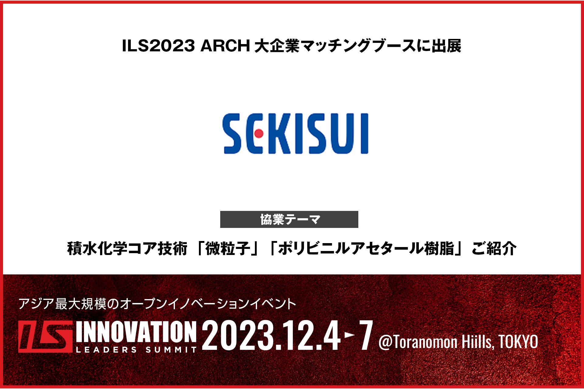 今回、ILS2023に、積水化学工業株式会社 開発戦略部が協業マッチングブースを出展します。