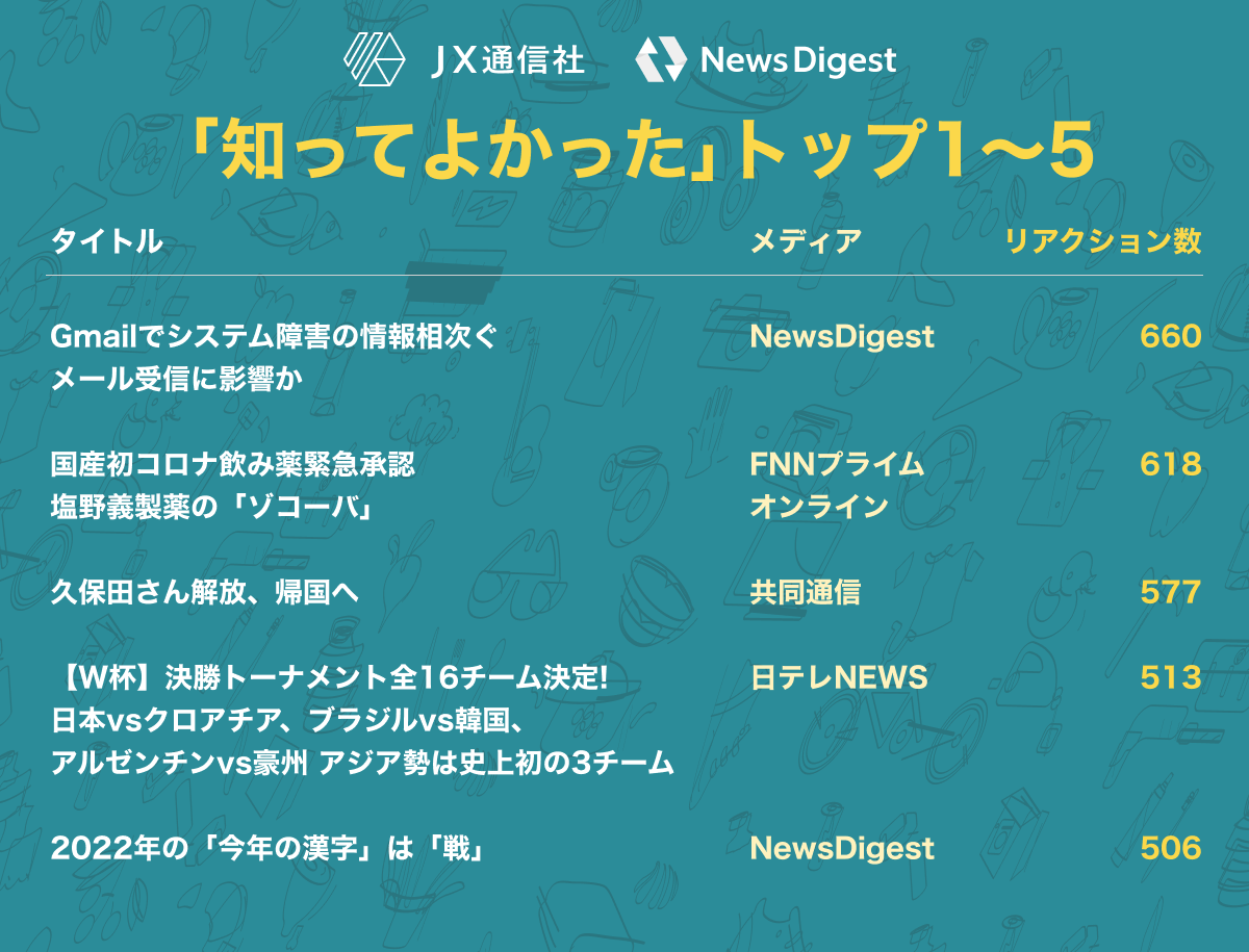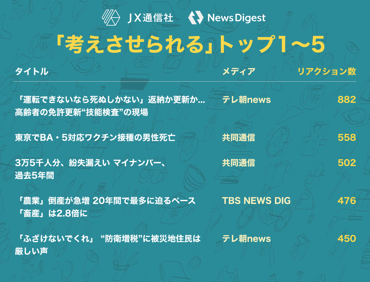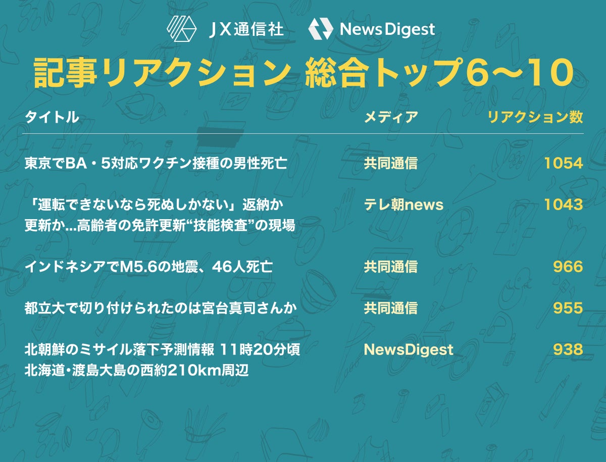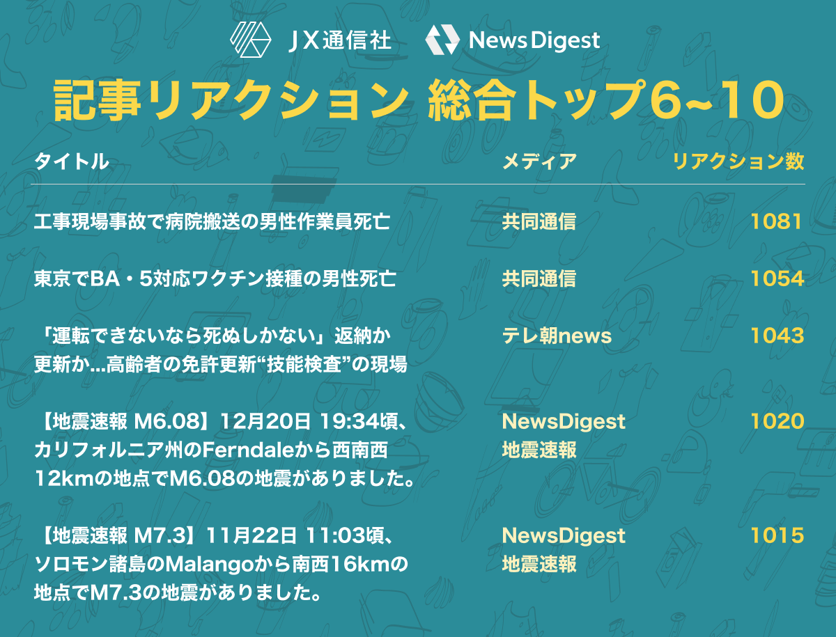 株式会社JX通信社(東京都千代田区/代表取締役 米重 克洋、以下 当社)は、運営するニュース速報アプリNewsDigestで配信している「ニュース記事へのリアクション」を集計し、2022年内に最もユーザの反応を集めたニュースを分析しました。その結果をお知らせいたします。