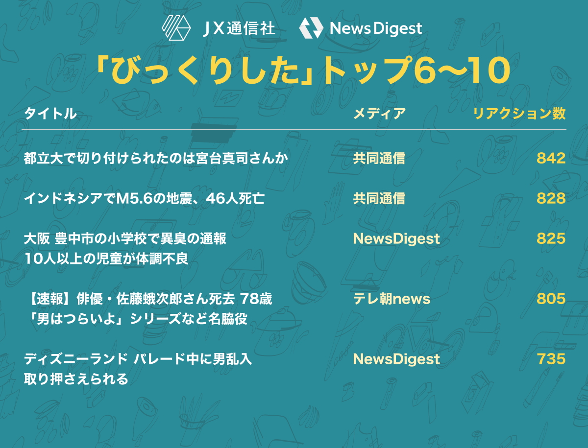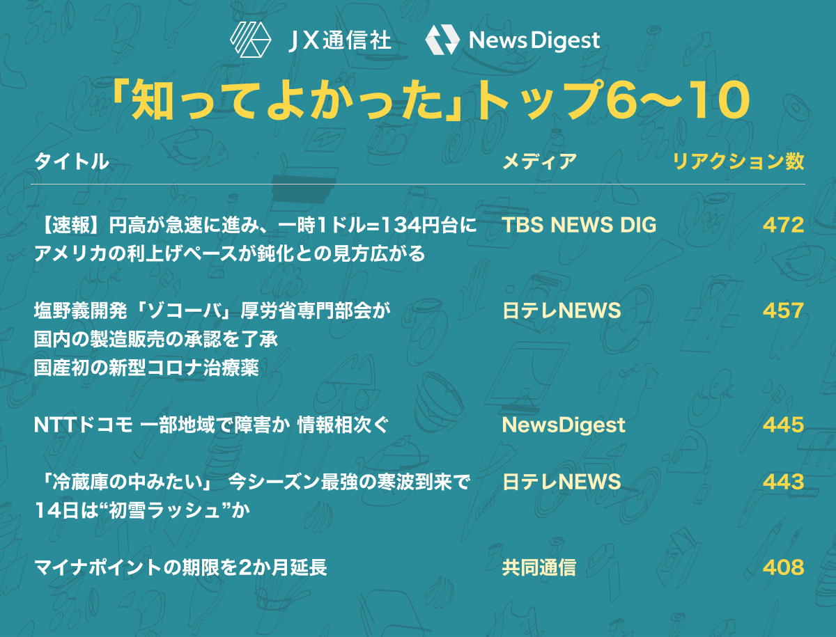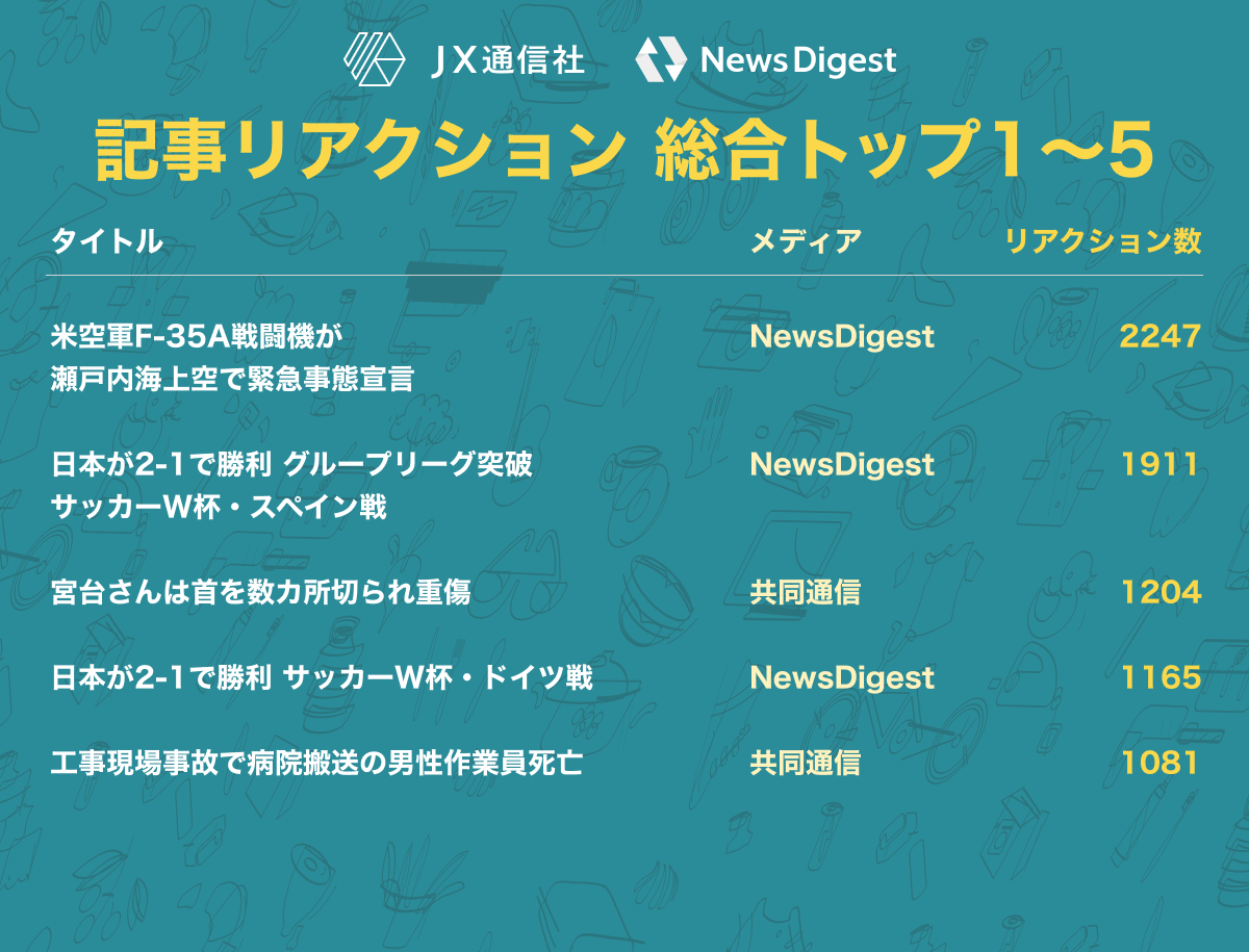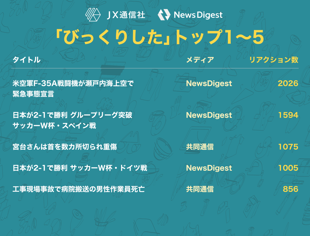 株式会社JX通信社(東京都千代田区/代表取締役 米重 克洋、以下 当社)は、運営するニュース速報アプリNewsDigestで配信している「ニュース記事へのリアクション」を集計し、2022年内に最もユーザの反応を集めたニュースを分析しました。その結果をお知らせいたします。